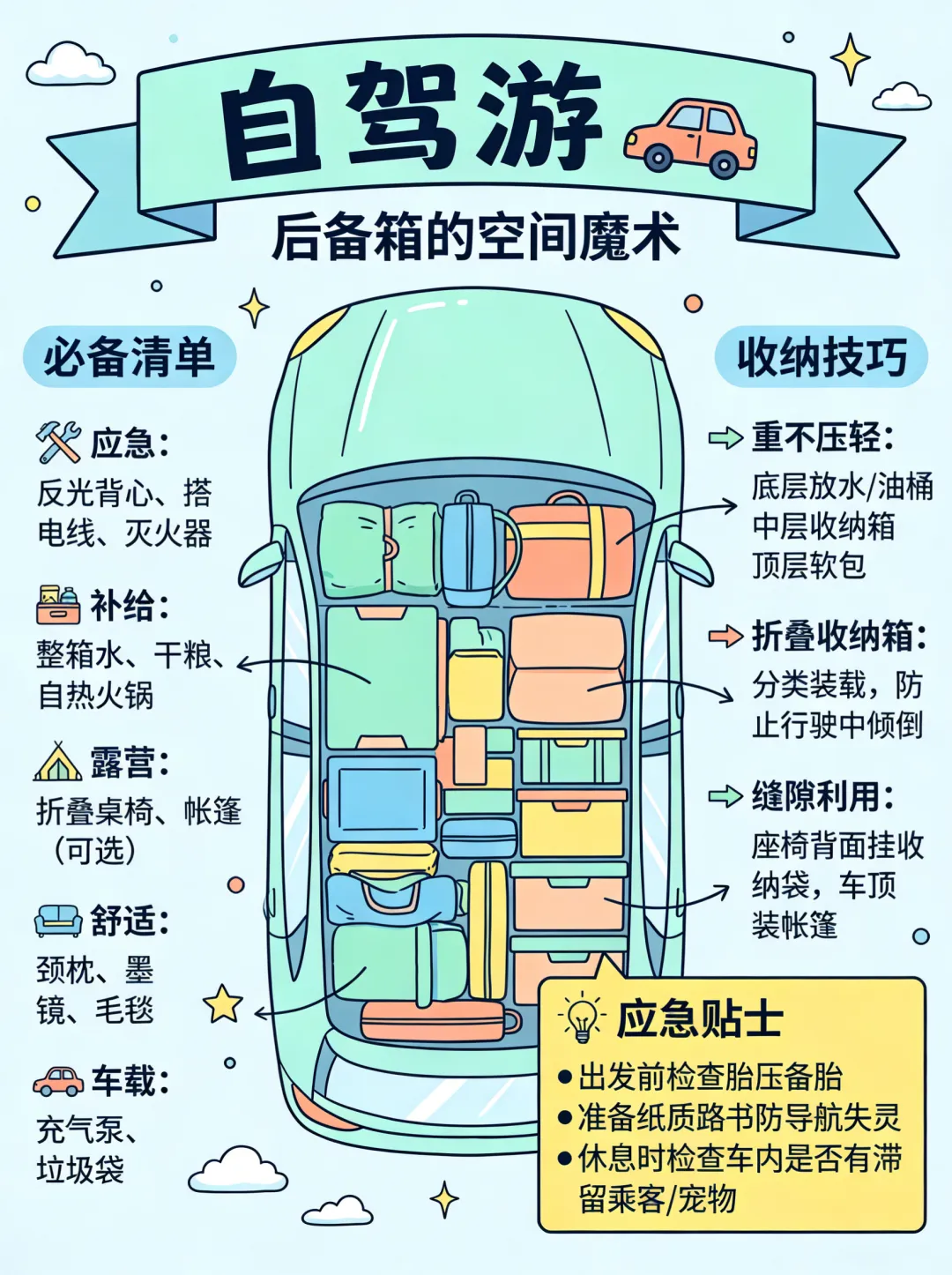应急工具:反光背心、搭电线、灭火器 生活补给:矿泉水、干粮 露营装备:折叠桌椅、防潮垫 车载用品:车载充气泵、垃圾袋