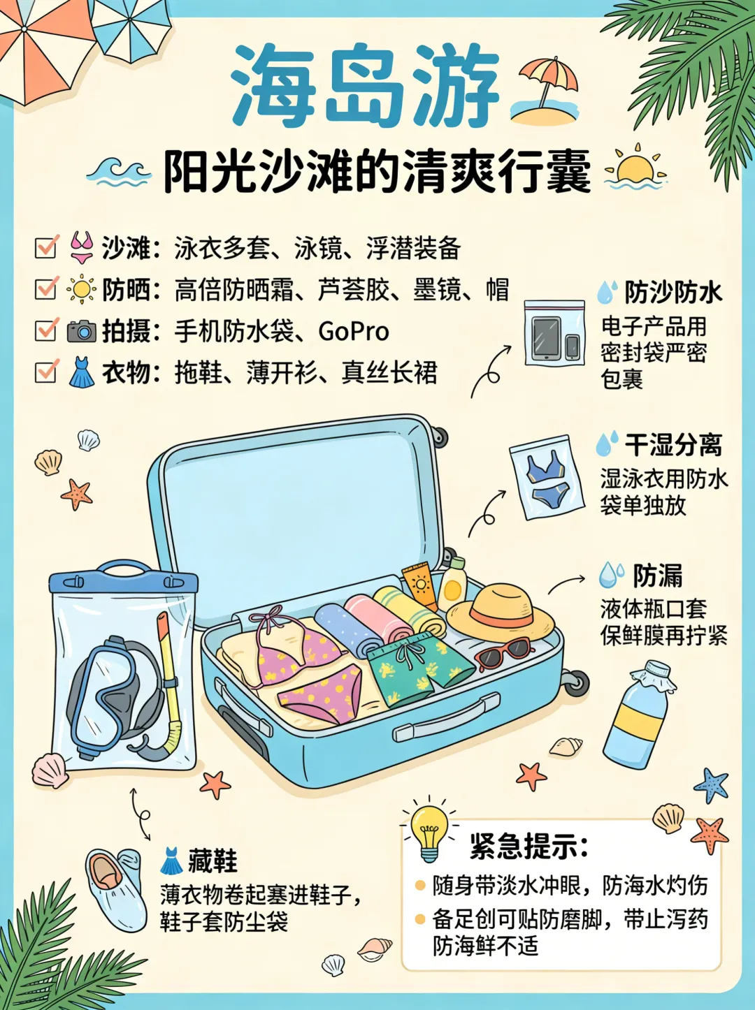 收纳技巧: 准备多个“密封袋”,将电子产品密封严实。泳衣可以用“防水干湿分离袋”存放。回程前务必将沙子抖干净。