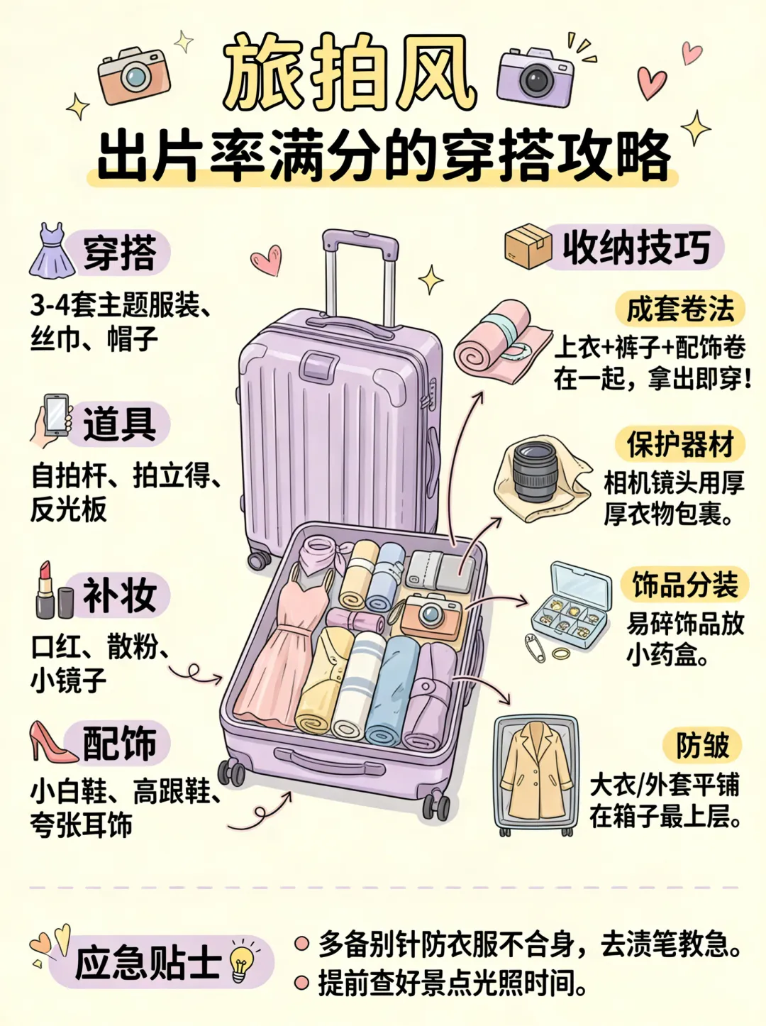 收纳技巧: 使用“衣物收纳袋”将每套搭配好的衣服单独卷成一个卷。贵重的相机镜头建议用厚衣物包裹。易碎的饰品用小药盒分装。