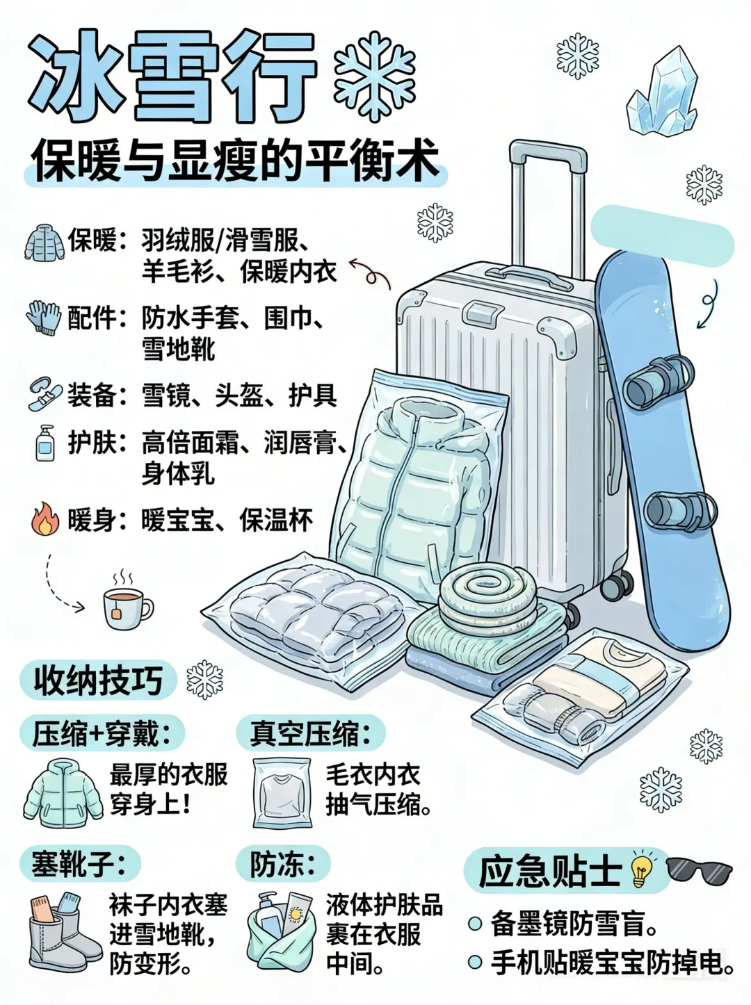 收纳技巧: 最厚重的衣服直接穿在身上。使用“真空压缩袋”将毛衣抽气。内衣袜子塞进靴子里。液体护肤品包裹好放在衣服中间。