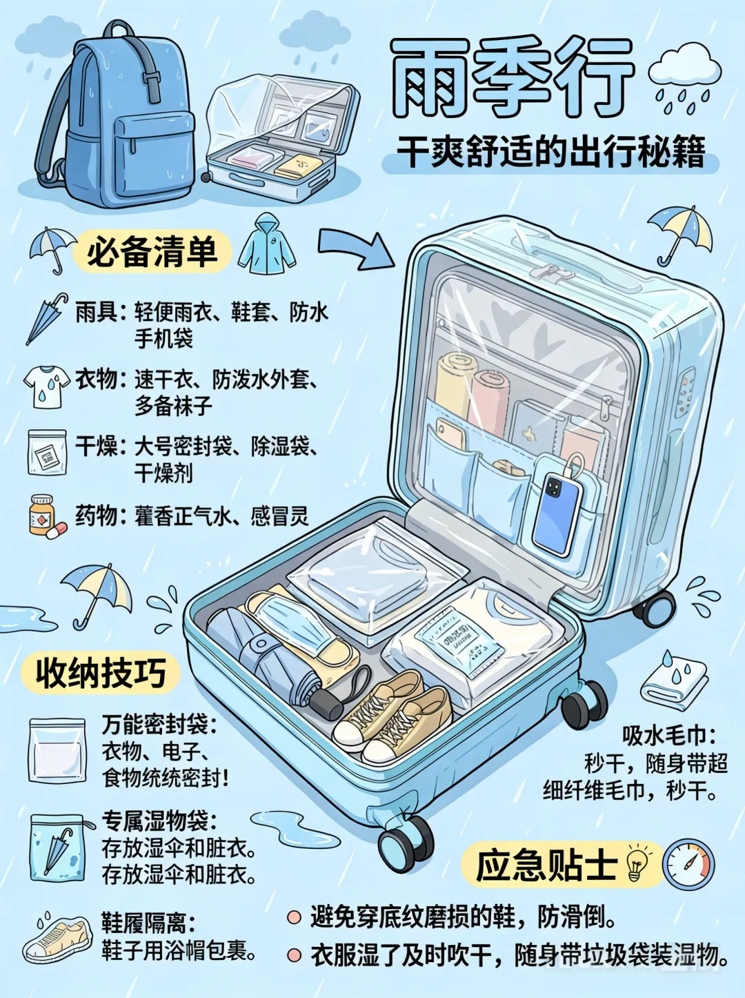 雨具装备:雨衣、伞、鞋套 衣物准备:速干衣、防泼水外套 干燥用品:硅胶干燥剂、除湿袋 足部护理:防滑鞋、纸巾
