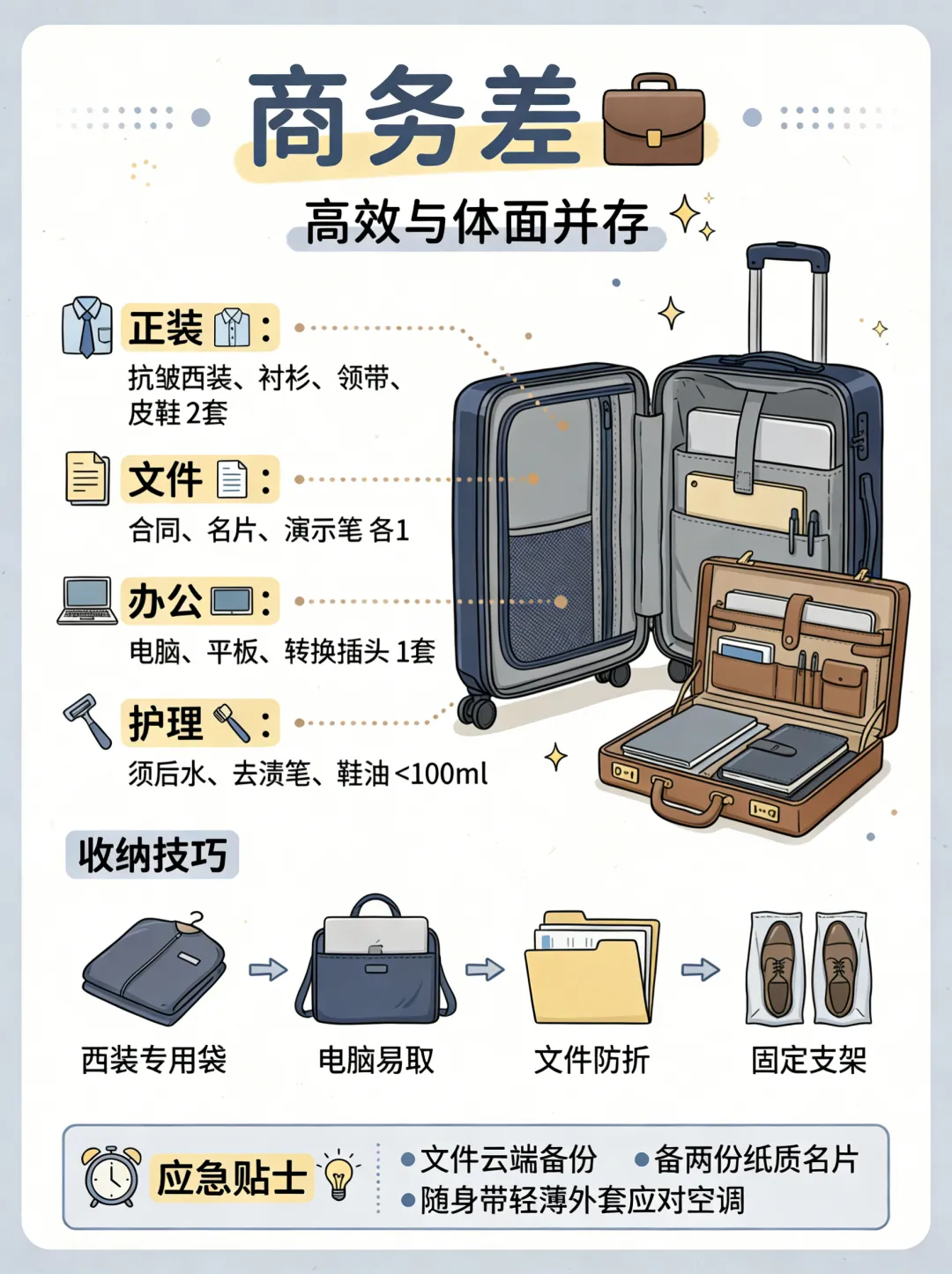 收纳技巧: 使用“西装专用袋”折叠西装,防止褶皱。衬衫领口可以用腰带支撑。电脑放在靠近箱提手的一侧,取用方便。