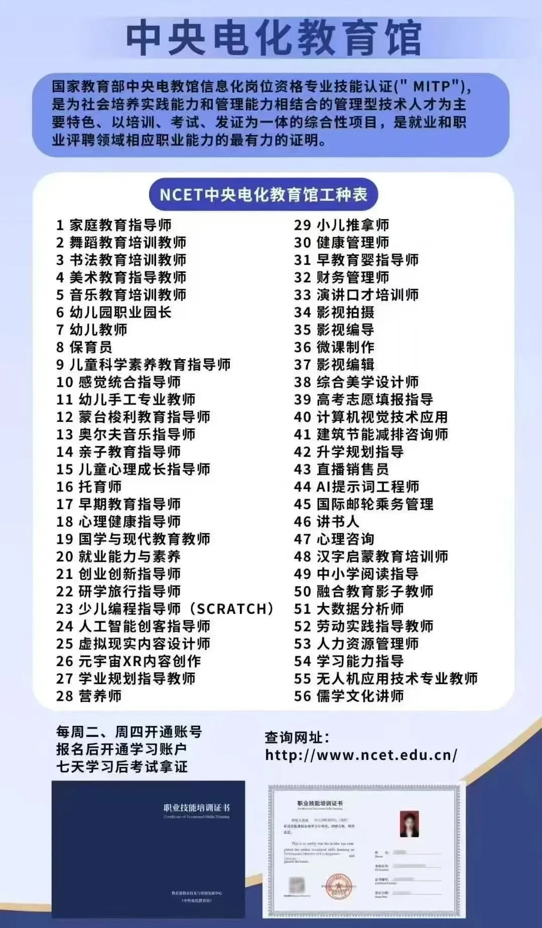 (2)幼儿教育类:幼儿园职业园长 幼儿教师亲子教育指导师幼儿手工专业教师感觉统合指导师 保育员儿童科学素养教育指导师 蒙台梭利教育指导师奥尔夫音乐指导师儿童心理成长指导师托育师