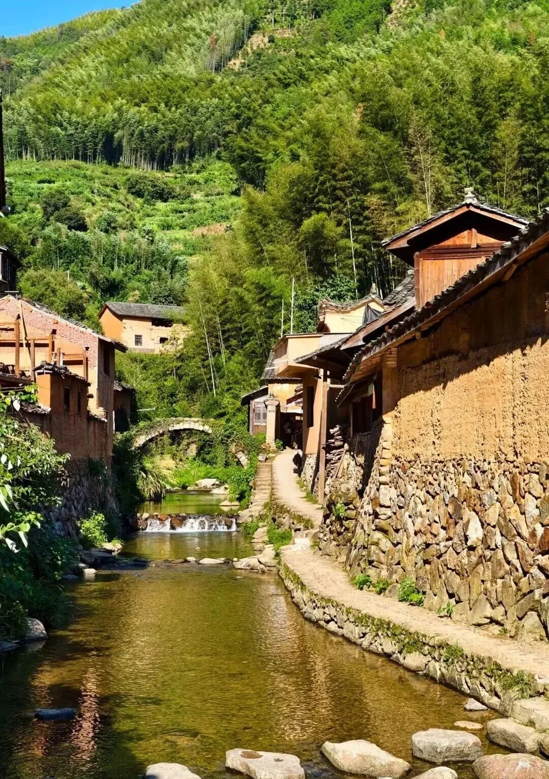 古村依山傍水而建,黄泥黑瓦的古民居沿溪流错落排布,被青山古树环抱。晨雾升起时,炊烟袅袅、溪水潺潺,妥妥的现实版世外桃源。