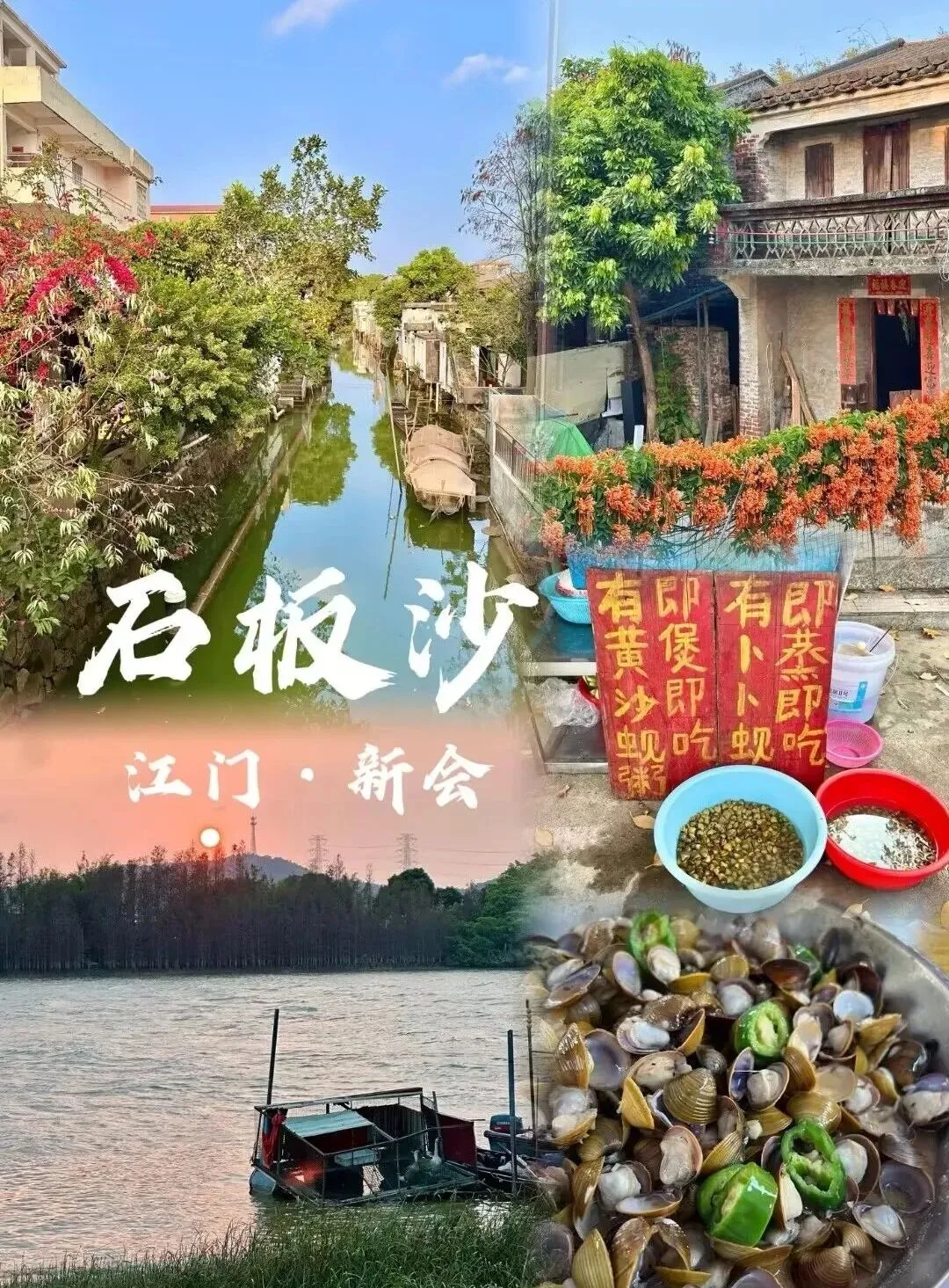 门票:登岛免费,往返船票 3 元 / 人 交通:珠三角自驾 1.5-2 小时可达,导航「石板沙村渡口」;高铁至江门东站,打车 40 分钟直达 最佳时间:4 月 - 5 月上旬,黄沙蚬最肥美 避坑贴士:车停渡口停车场,坐船上岛;可租自行车环岛,10 元 / 小时;节假日建议错峰用餐