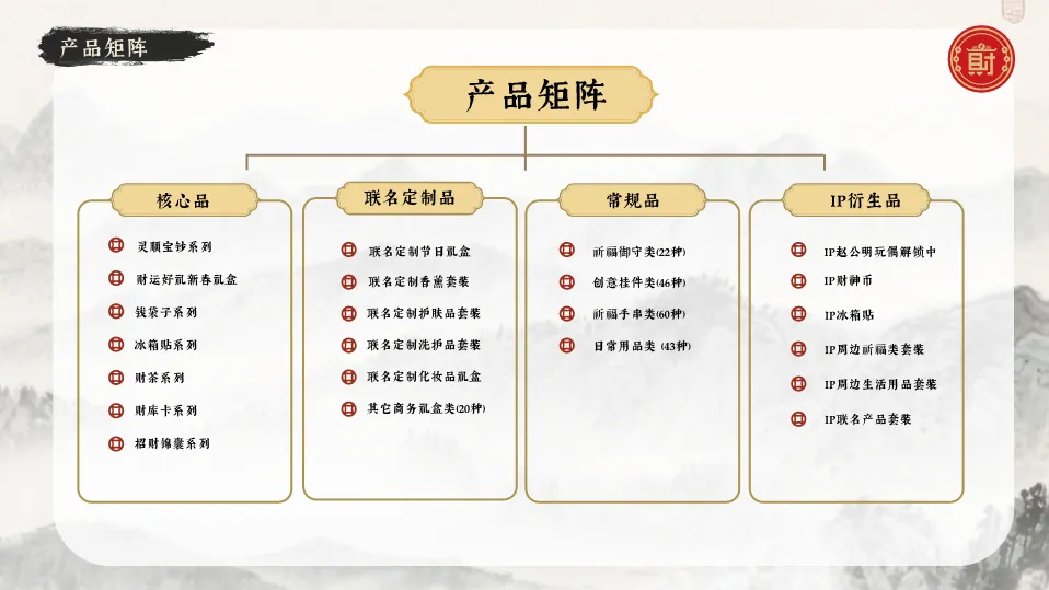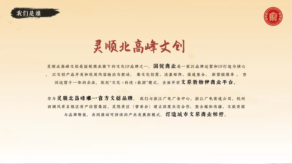 本手册系统展示了“灵顺北高峰”文创品牌的完整构建与运营体系。品牌依托杭州北高峰“天下第一财神庙”的千年财福文化底蕴,定位为“传承华人千年财智,创领当代吉运新篇”。手册详细阐述了其IP资产体系(如五路财神形象),构建了涵盖核心品、联名品的产品矩阵,并通过线上线下全渠道矩阵进行运营。核心亮点在于其创新的商务合作模式,通过品牌联名、产品合作、授权合作等方式,与珀莱雅、霸王茶姬等众多品牌成功跨界,将传统文化IP转化为强大的商业势能与社交货币,为文旅文创品牌打造提供了可复制的范本。