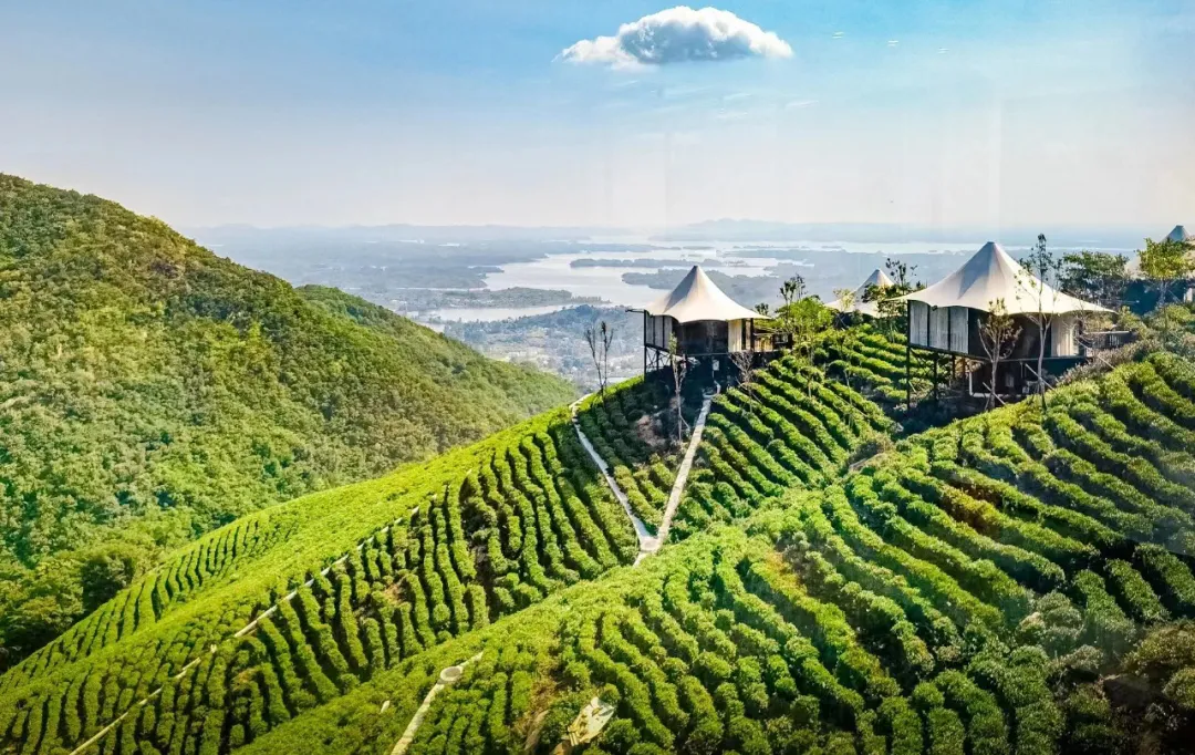山顶核心网红打卡点,玻璃观景台与蓝天、茶山、南湾湖倒影交融,随手出大片。最佳拍摄时间7:00-9:00(晨雾)、17:00-19:00(黄昏),建议穿纯色长裙。