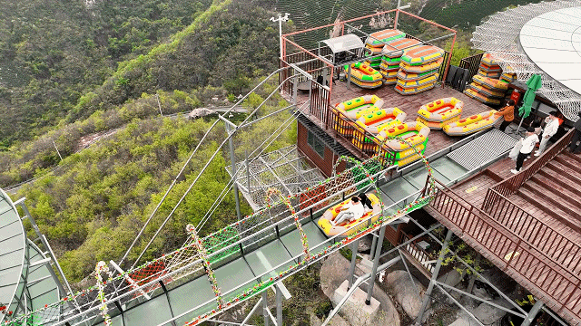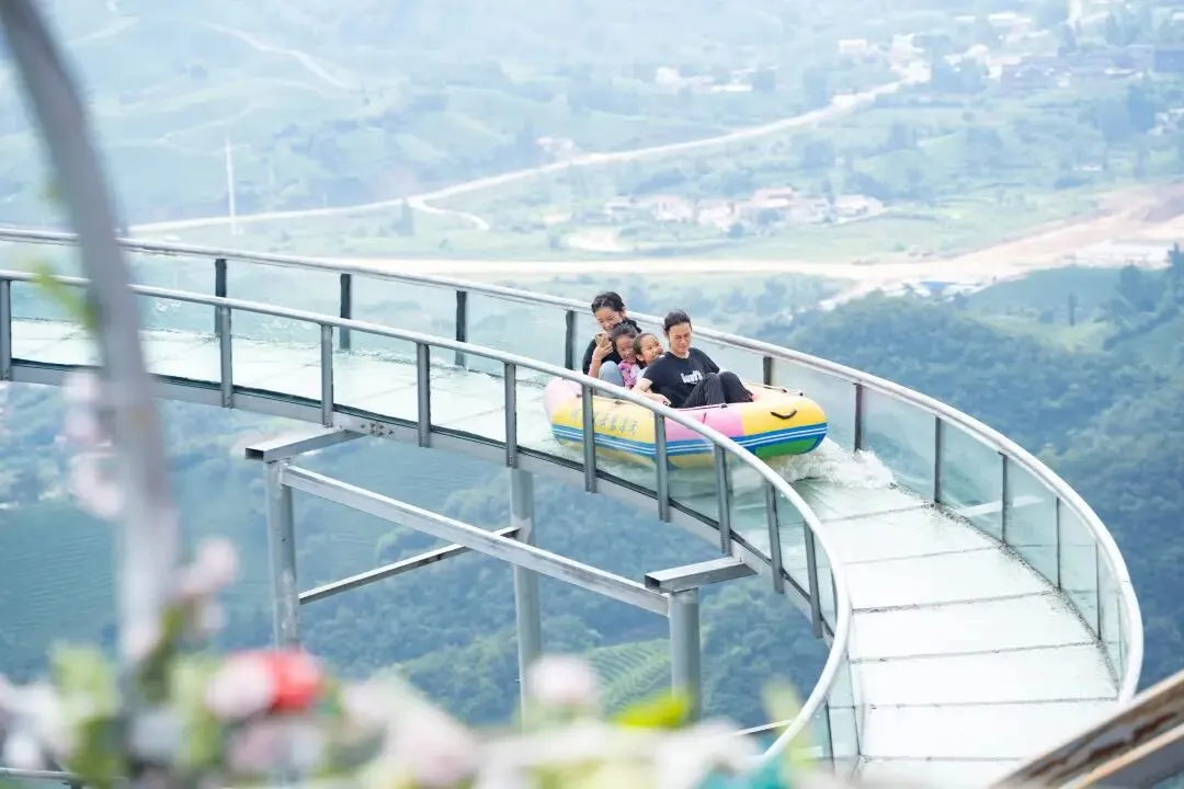 全长1314米的玻璃水滑道,螺旋盘绕于茶山密林间,乘坐皮划艇顺流而下,速度与美景兼具,体验“水上飞升”之感。