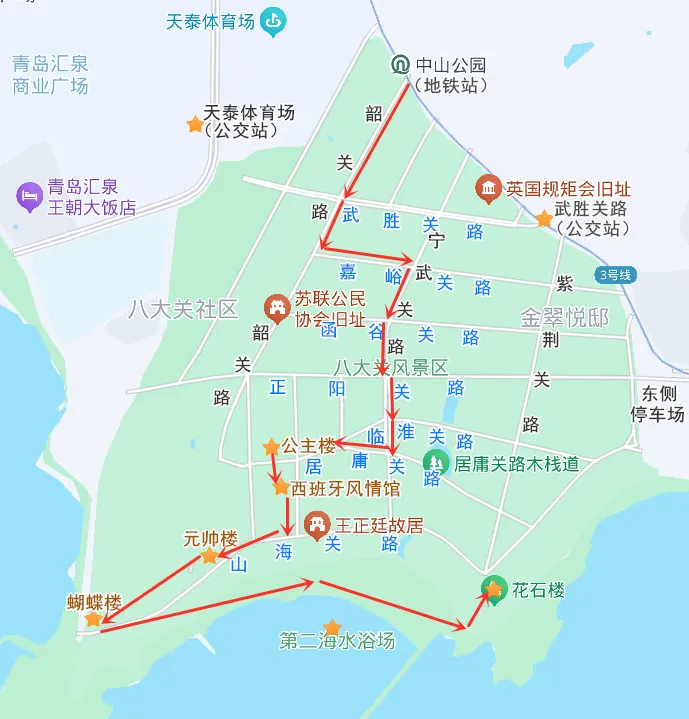以下是八大关经典步行游玩路线: