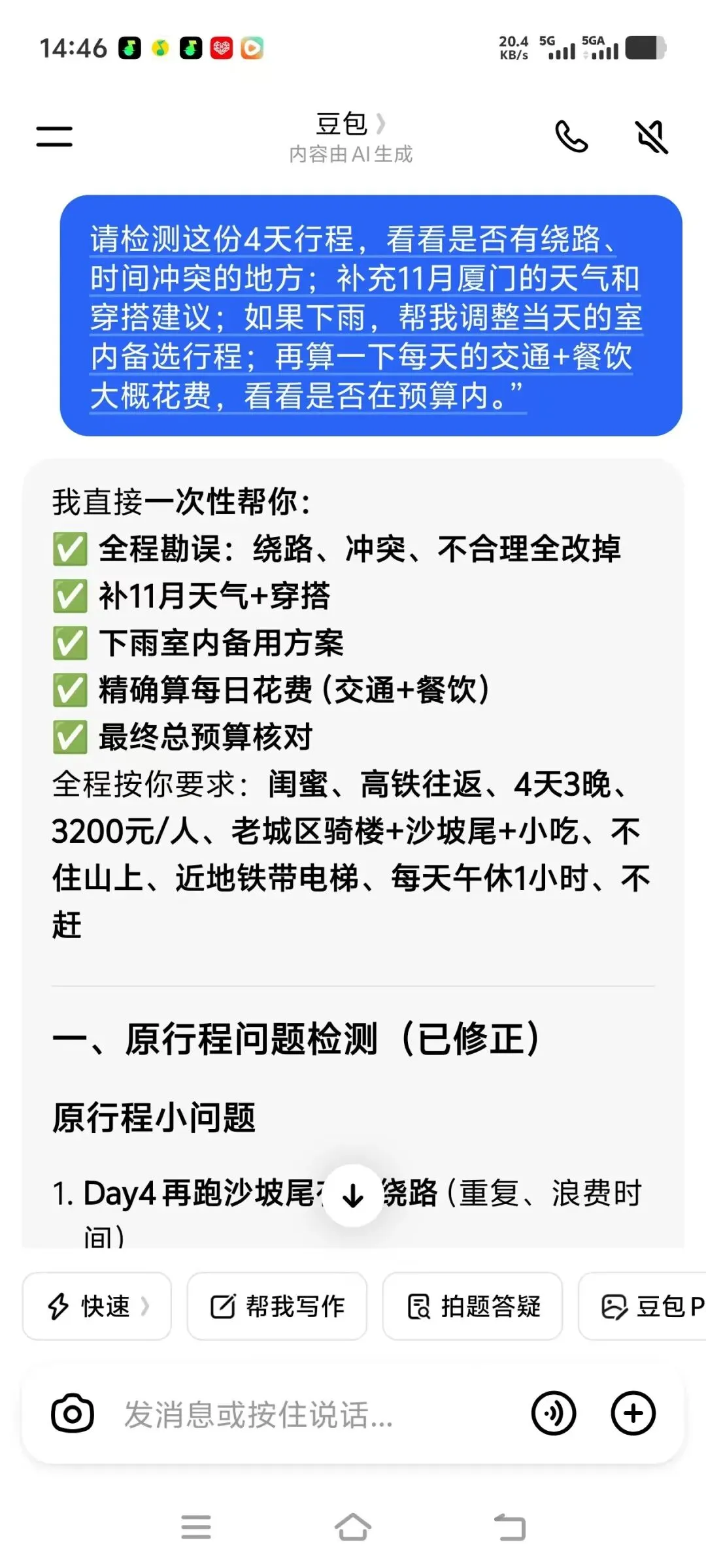 可以这样提问:“请检测这份4天行程,看看是否有绕路、时间冲突的地方;补充11月厦门的天气和穿搭建议;如果下雨,帮我调整当天的室内备选行程;再算一下每天的交通+餐饮大概花费,看看是否在预算内。”