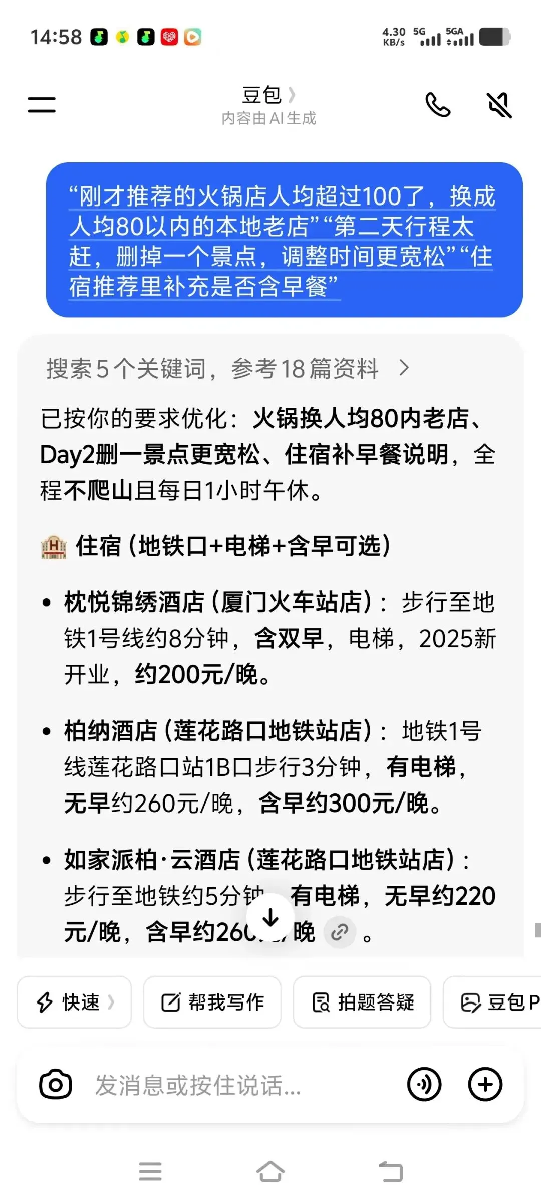 “刚才推荐的火锅店人均超过100了,换成人均80以内的本地老店”“第二天行程太赶,删掉一个景点,调整时间更宽松”“住宿推荐里补充是否含早餐”