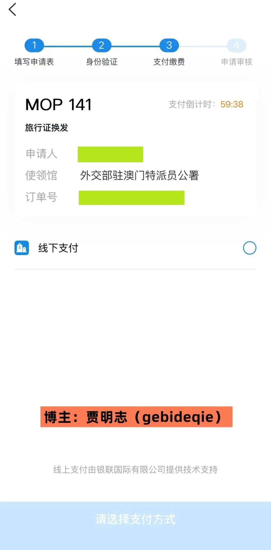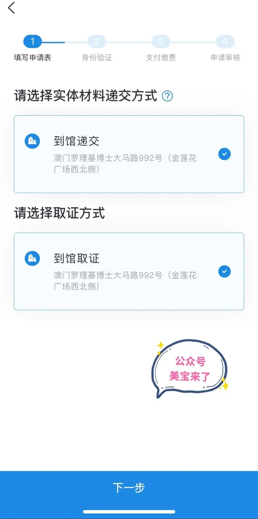 资料上传后,就是选择办理方式,交费,等待初审。目前澳门仅支持:现场办理,现场取证,现场交费。