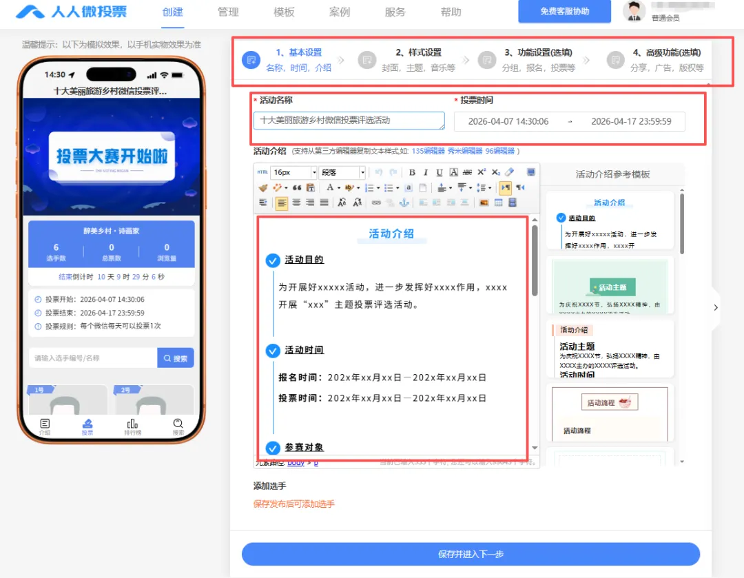 2、按照平台要求一步一步完善活动的名称、投票时间和活动介绍等各种设置要求。