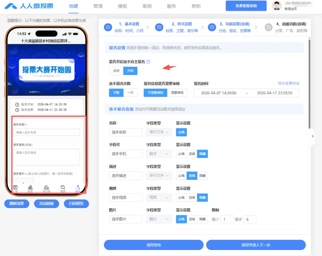 3、不要忘了在【功能设置】里开启选手自主报名上传选手的资料,也可以在【管理】界面的【添加选手】统一上传参赛选手的各种基本信息。