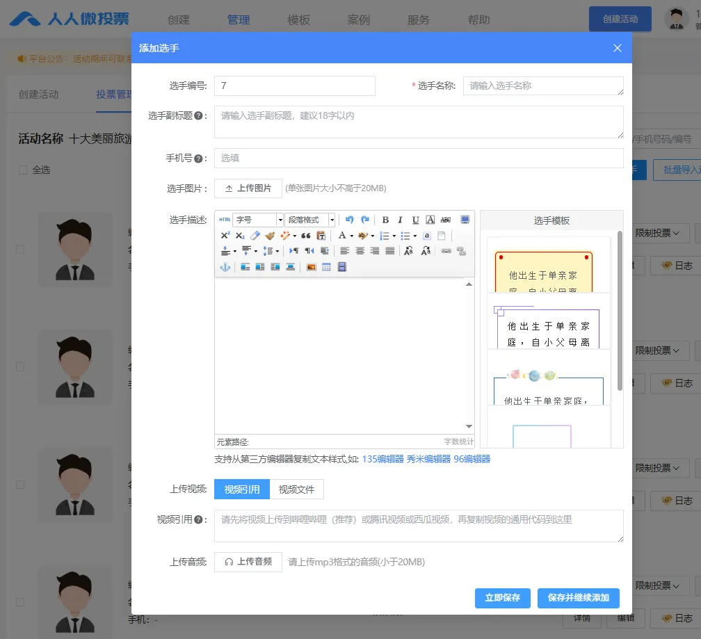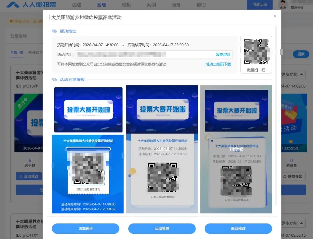 这里推荐一款好用免费的投票制作平台——人人微投票,该平台操作简便、功能齐全、支持图文、视频展示,可生成专属海报、投票链接,方便活动传播与数据统计。且全程免费无隐形消费,适配微信生态传播需求,能够确保投票过程公平、公正、高效。