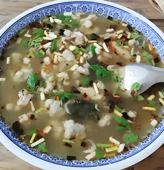 第四美食:滑脊汤这道菜是濮阳宴席的“头牌”!猪里脊裹上红薯淀粉敲打成薄片,滑进酸辣汤里,肉片嫩如豆腐,汤底胡椒点睛。喝一口,鲜得眉毛掉下来。推荐店:濮城镇十字街北的老字号滑脊汤。人均25元,配个烧饼绝了。