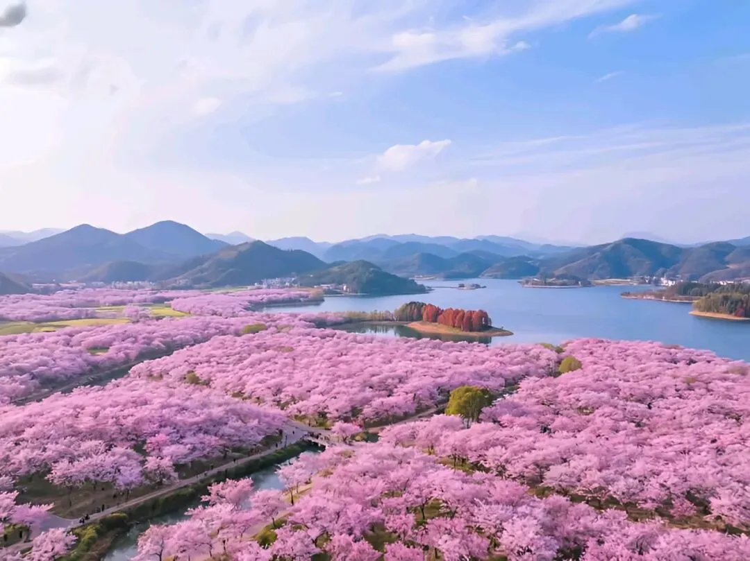 4月初的平坝,70万株樱花铺满2.4万亩山坡,红枫湖旁的粉色云海宛如梦幻仙境。