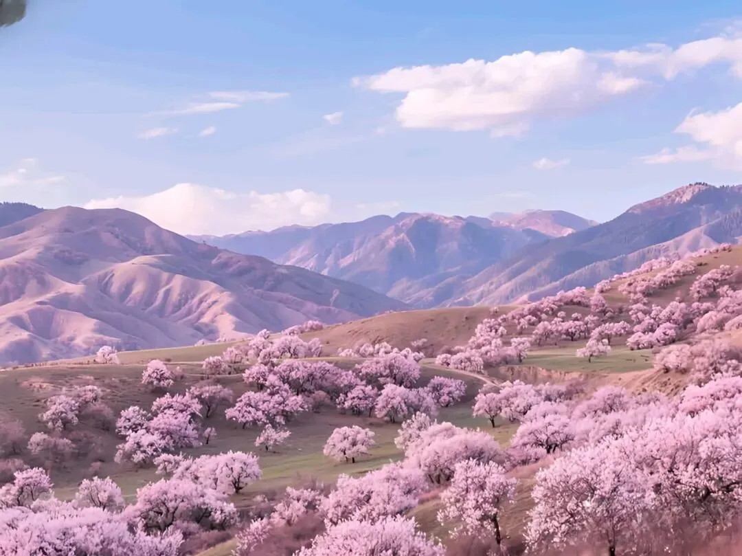 4月上旬的伊犁,中世纪遗留的野杏林顺着山势铺开,粉色花海覆盖山谷。