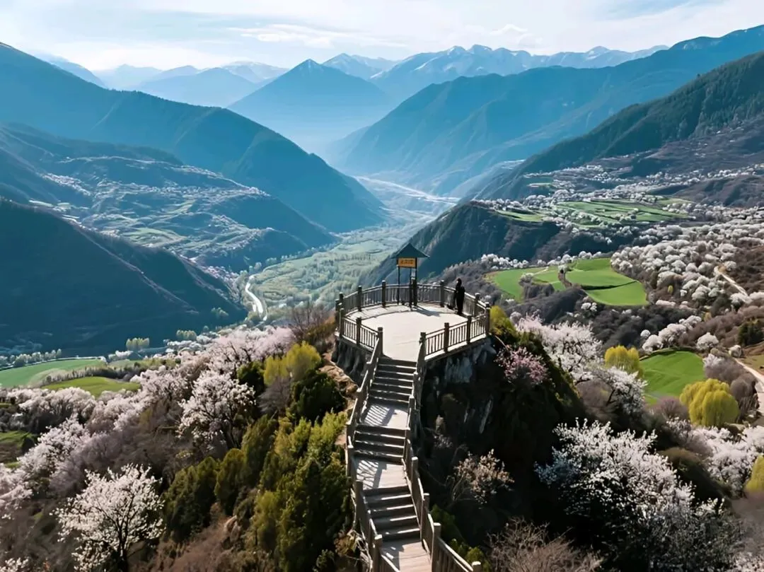 粉色桃花与雪山、青稞田交织,构成史诗级的春日画卷。