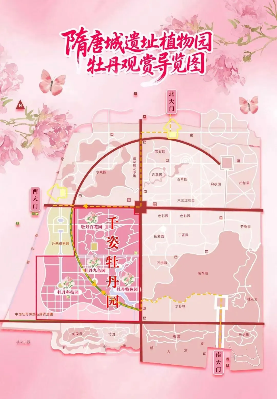 隋唐城遗址植物园西门、北门、南门三个出入口,距千姿牡丹园均不远,且园内道路两旁休闲区分布密集,赏花途中歇脚十分方便。