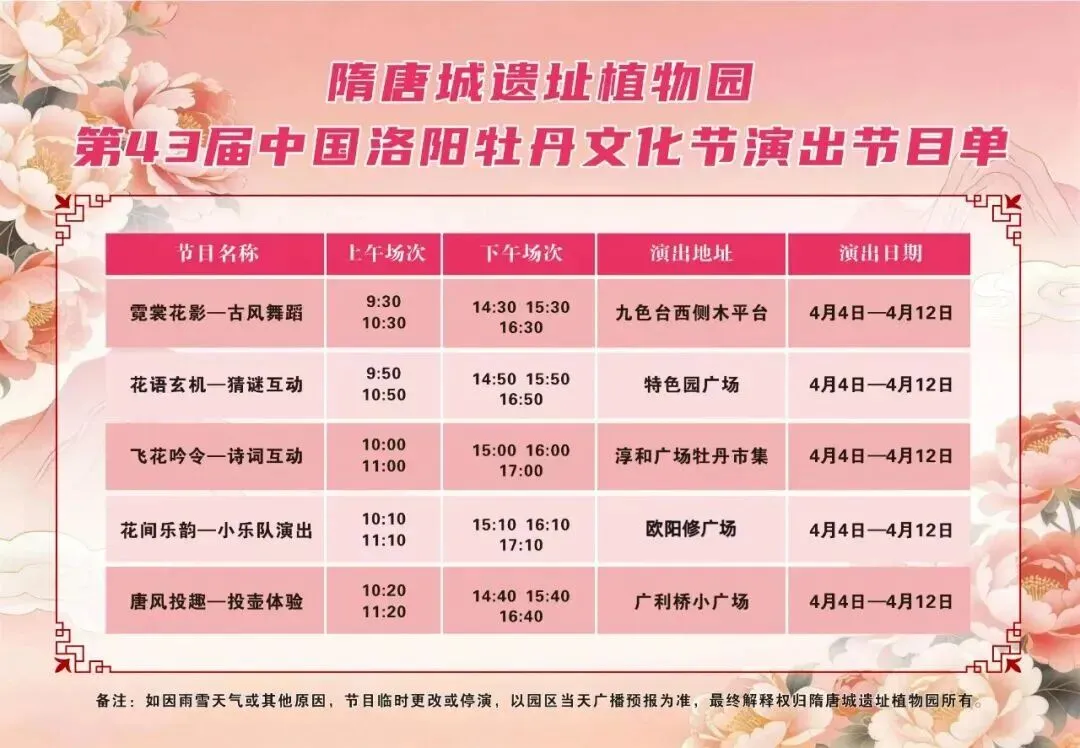 今年牡丹文化节期间(4月4日至4月12日),隋唐城遗址植物园将推出多项沉浸式游园活动: