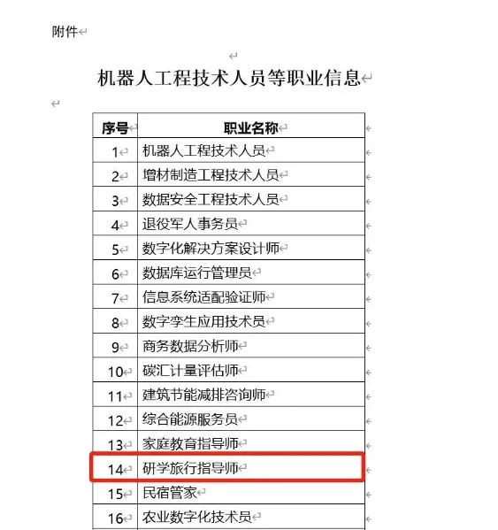 2022年6月14日,人力资源和社会保障局发布《关于对拟发布机器人工程技术人员等职业信息进行公示的公告》,公告包含了18个新职业信息,向社会公示并广泛征求意见。其中包括研学旅行指导师、民宿管家、碳汇计量评估师等职业信息。