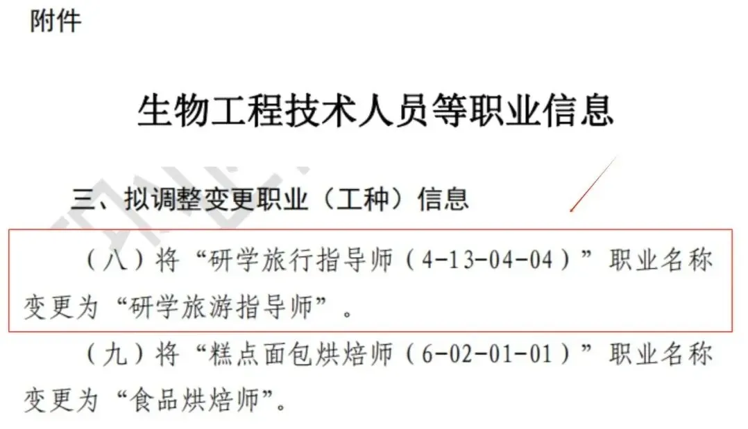 近期,人力资源社会保障部发布公告,公示一批新职业信息,附件中拟调整变更职业(工种)信息明确提出将“研学旅行指导师(4-13-04-04)”职业名称变更为“研学旅游指导师”。