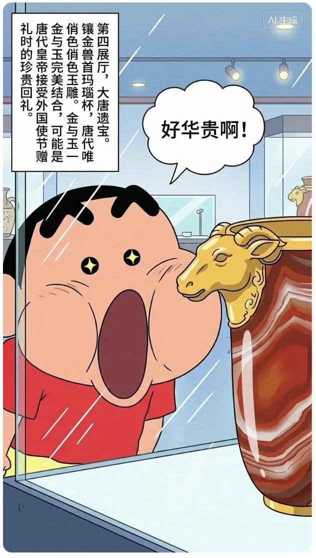 杯身由一块罕见的红玛瑙雕琢而成,两端镶嵌着栩栩如生的兽首,金与玉的完美结合,透露出一种超越时代的华贵。可能是唐代皇帝接受外国使节赠礼时的珍贵回礼。