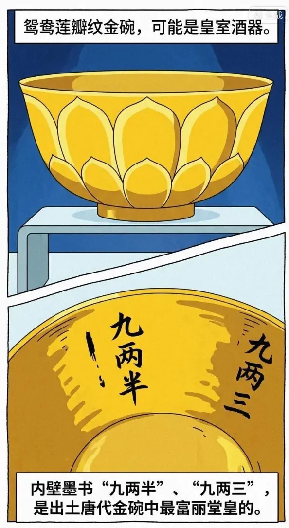 可能是皇室酒器,共出土两件。碗壁捶作出两层向外凸鼓的莲花瓣纹,每层十片,上下轮廓相合,莲瓣刻有装饰图案,上为动物纹,下为忍冬花。两碗内壁分别墨书“九两半”、“九两三”。是已出土的唐代金碗中最富丽堂皇的金碗。
