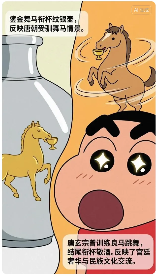 反映了唐朝受驯舞马的情景,壶上提梁、壶盖、骏马鎏金,与银色辉映。唐玄宗曾引进外来良马训练表演舞蹈,百匹同演。结尾舞马会衔起酒杯向玄宗敬酒。银壶反映了唐代宫廷的奢华生活,也是汉族和少数民族文化交流的见证。