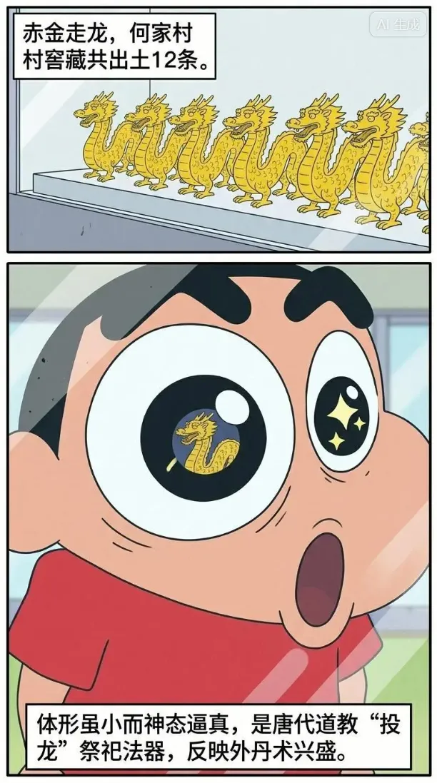 为一组小金龙,何家村窖藏共出土了 12 条赤金走龙,均纯金制成,体形虽小而神态逼真。身材纤细,金龙身饰深凹鳞纹,作各种姿态的行走状。赤金走龙是首次发现的小型铜龙型制品,被认为是唐代道教“投龙”祭祀仪式中所用的法器,反映了唐代道教外丹术的兴盛。