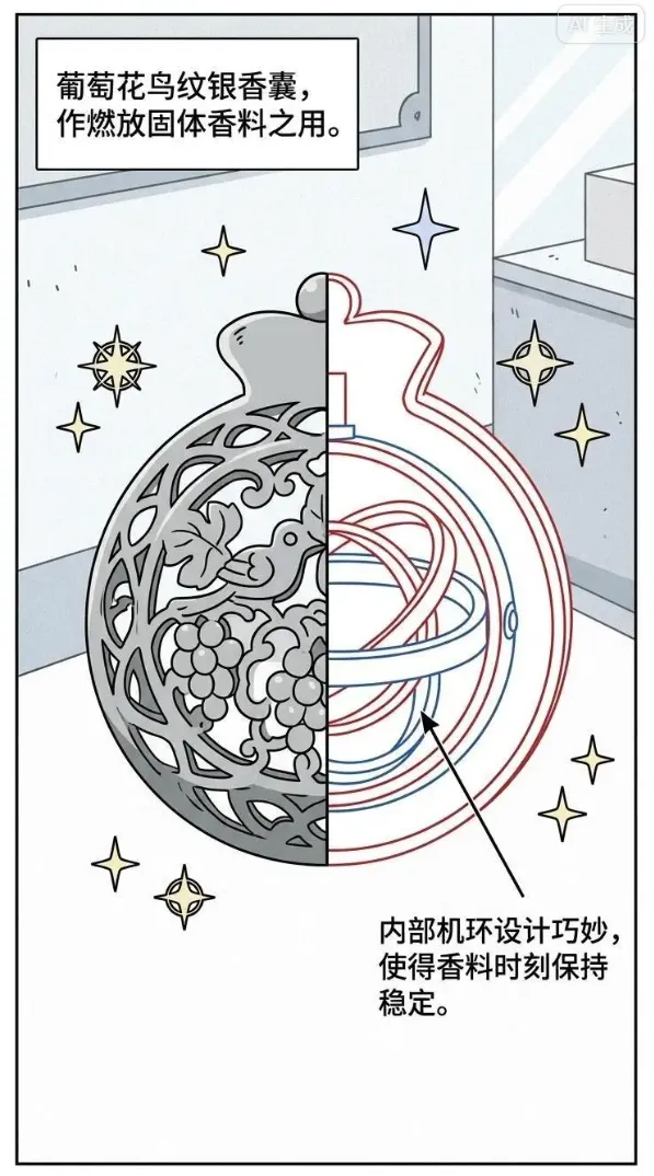 作燃放固体香料之用。香囊外壁用银制,整体镂空,以中部水平线为界平均分割形成两个半球形,上下球体之间,一侧以钩链相勾合侧以活轴相套合,下部球体内又设两层银制的双轴相连的同心圆机环,使得香料时刻保持稳定。