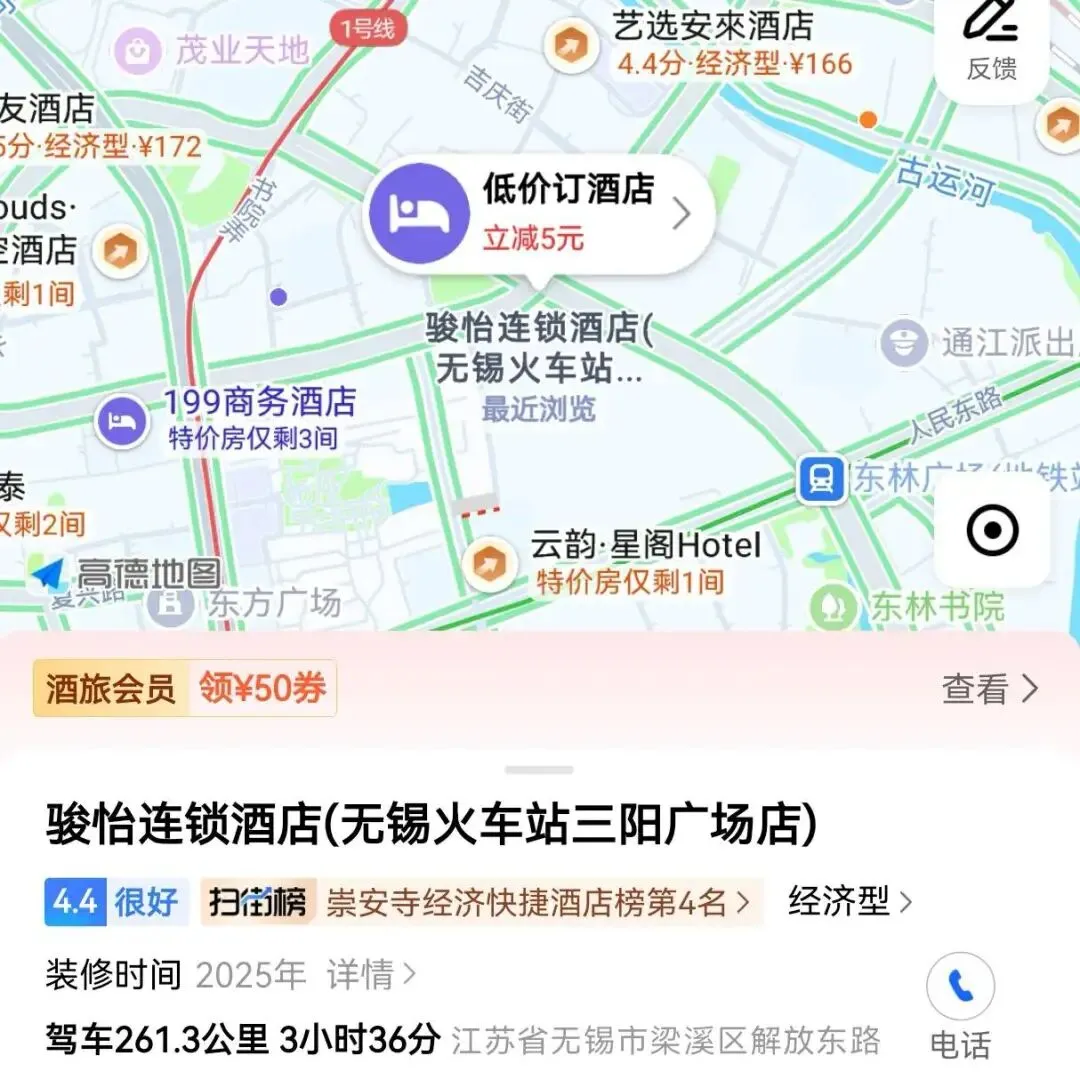 住宿地:骏怡连锁酒店(无锡火车站三阳广场店)