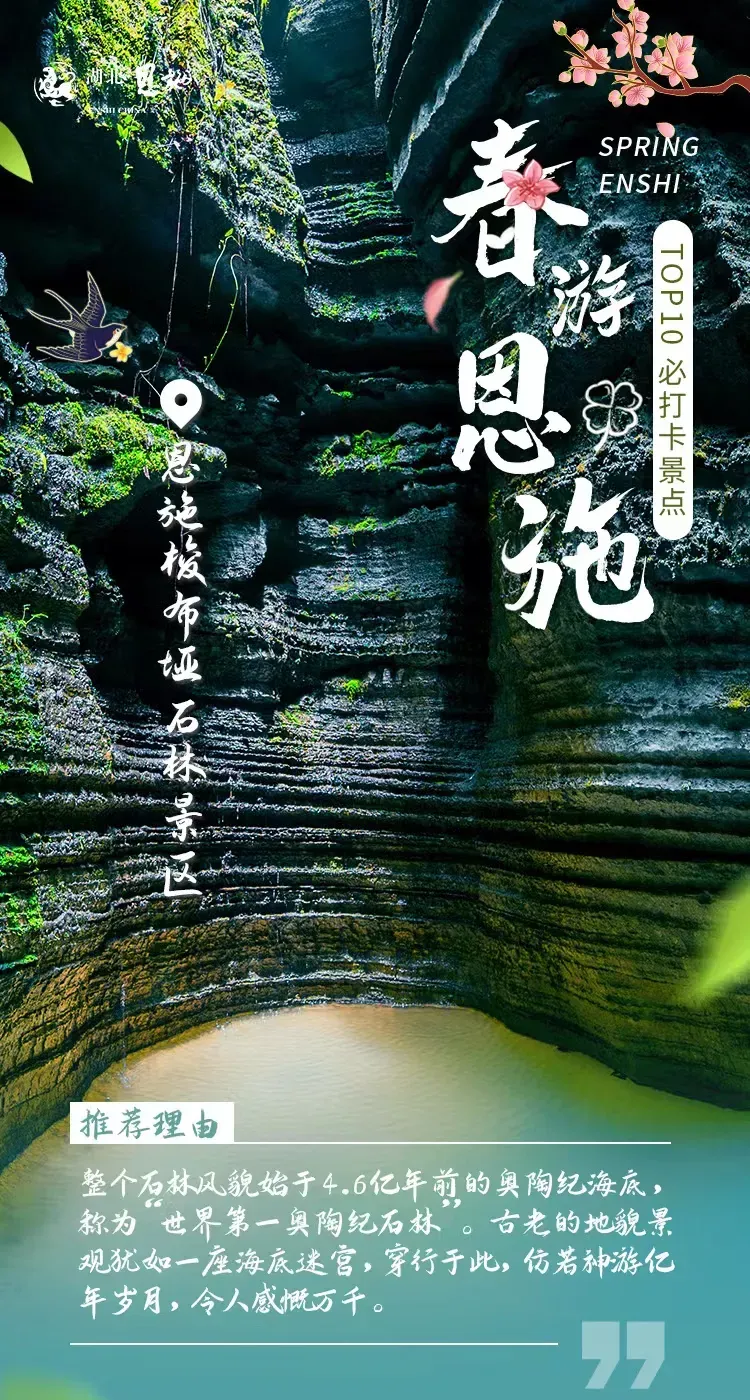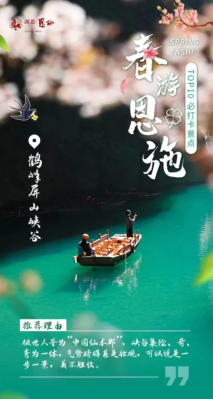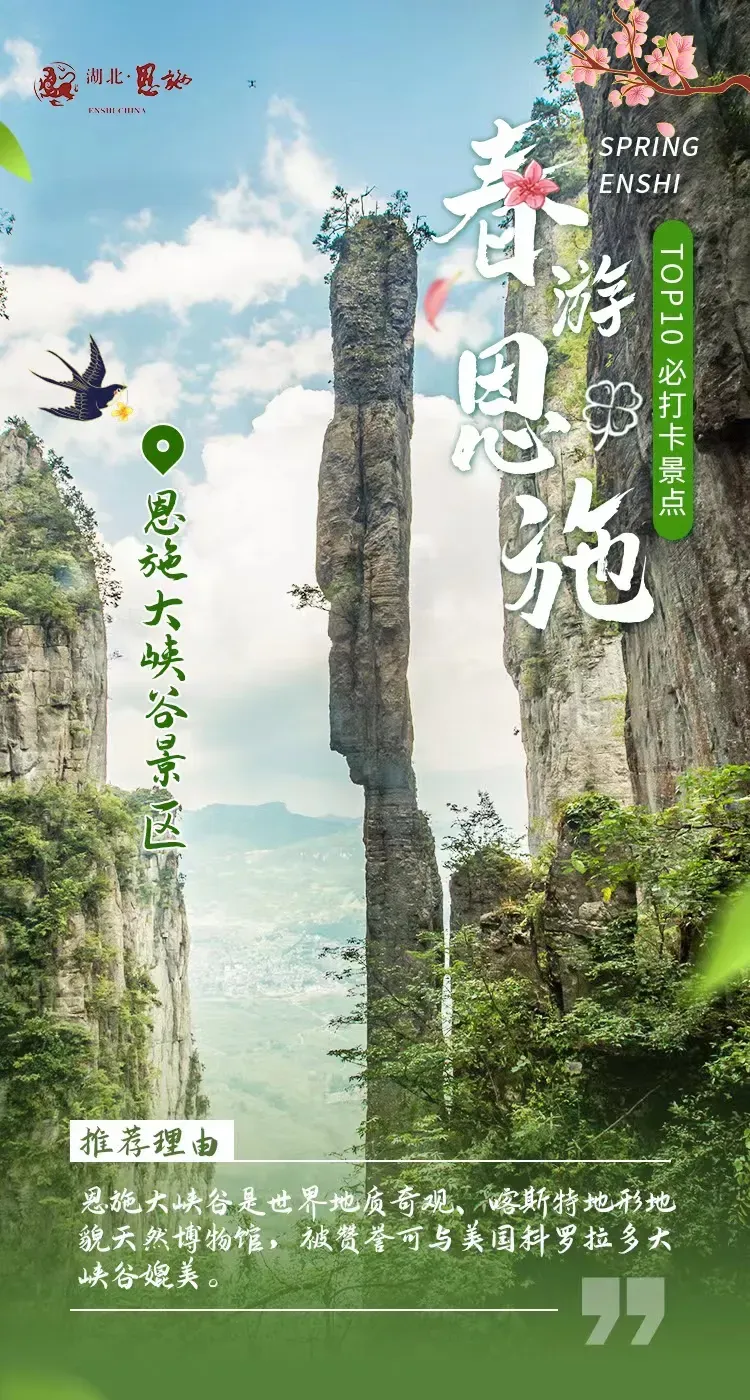 恩施最值得去的景点,你打卡过了吗?正值春暖花开时,来恩施约起,打卡宛如“人间仙境”山水盛宴,邂逅世外桃源般的自然风光,观赏大自然鬼斧神工的地质景观,体验恩施浓郁的民族风情。行程以为你备好,这个春天,相约美丽恩施,感受春天的惬意与美好吧!