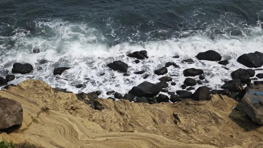 那晏湾石滩在硇洲岛的最东部,与最西部的硇洲小镇相隔数公里,分别是看日出与日落的好地方。这是一条百多米长,约三百米宽的沙滩带,沙滩细粒松柔,银色的沙滩和一片怪石嶙峋的乱石林,两旁环抱着黑色的火山熔岩礁石,特别像是一个巨大的“凹”字。万年前的火山在这里喷发,滚烫的熔岩遇到空气和海水冷却后,形成了这些嶙峋的黑色石头。