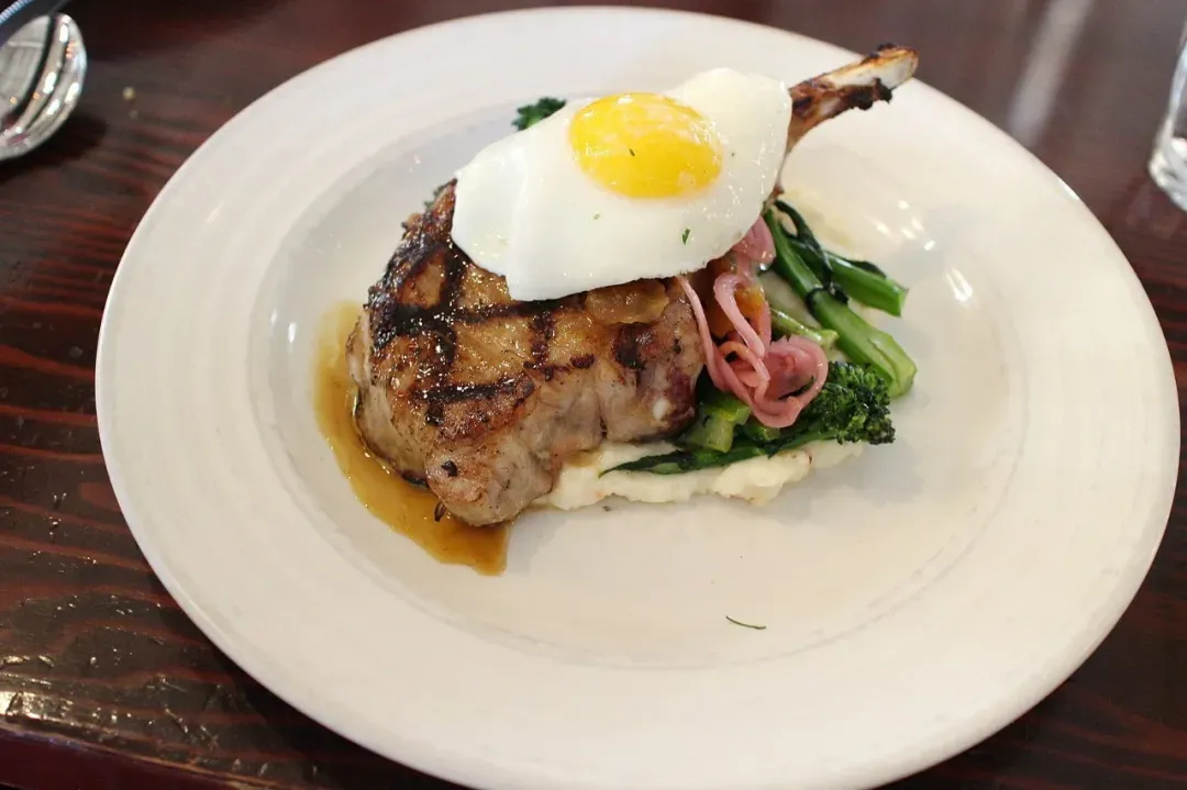 推荐一下附近很好吃的美式餐厅,位于Saint Helena紧邻纳帕最主要的Hwy 29道路,在品酒列车铁轨旁边,十分显眼。菜色选择种类丰富,而且每一份都有一定的水准,特别推荐木火烤猪排、西班牙海鲜汤、新鲜现烤鳟鱼,都非常可口。