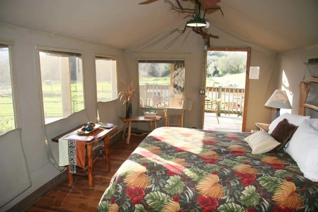 第一天游历的Safari West提供过夜服务,这里让你露营住帐篷,彻底体验非洲风情(真的是南非来的)!这里的帐棚超顶级,位在高脚木屋的帐篷除了干净舒适床好睡,里头也有厕浴热水等必备设备,完全是升级版野外露营,让全家以旅馆般的住宿品质体验非洲野营,隔天起床还能和长颈鹿等动物近距离接触 (附早餐)!