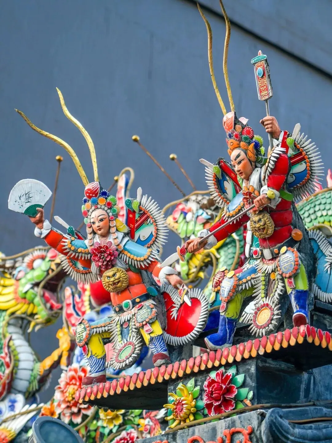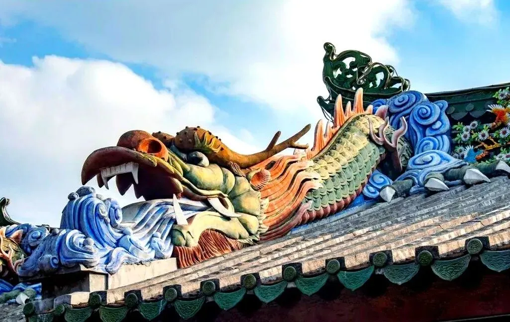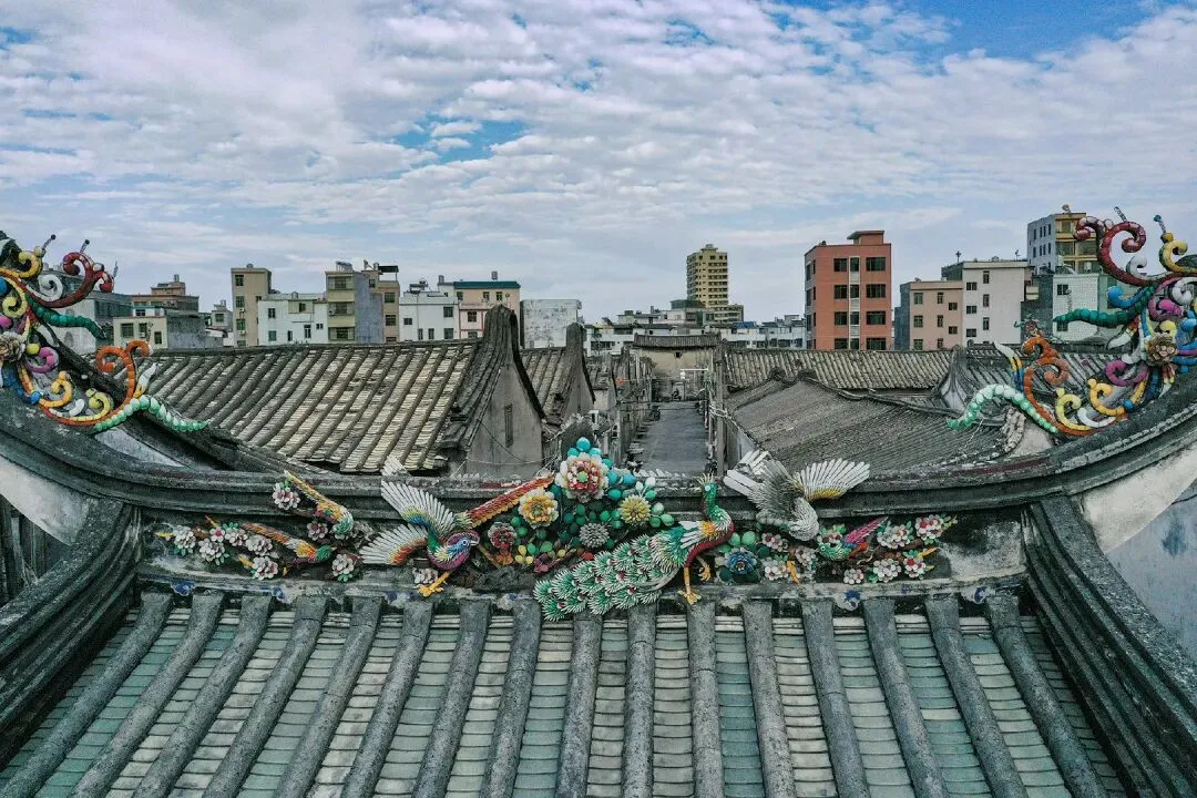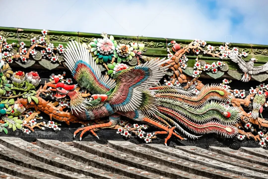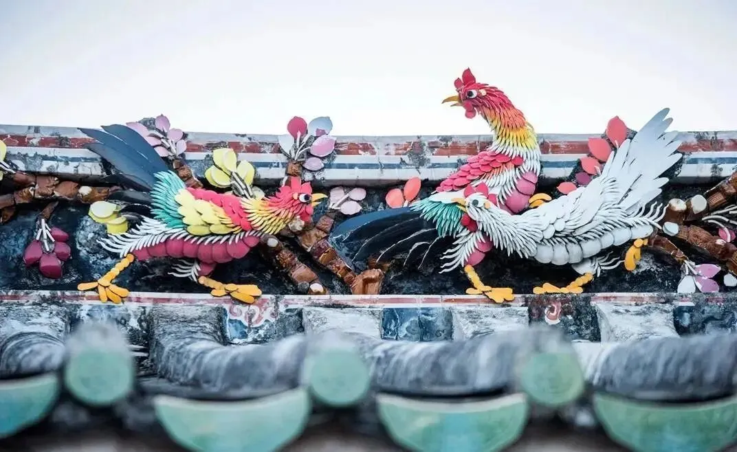 嵌瓷:屋顶脊饰采用潮汕独有工艺,将彩色瓷片切割打磨后镶嵌成人物、动物、花卉图案,色彩浓艳、构图精巧,被誉为“永远亮丽的造型艺术”。