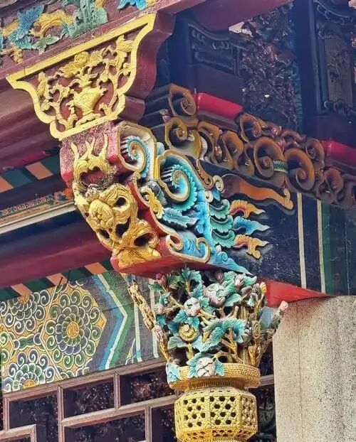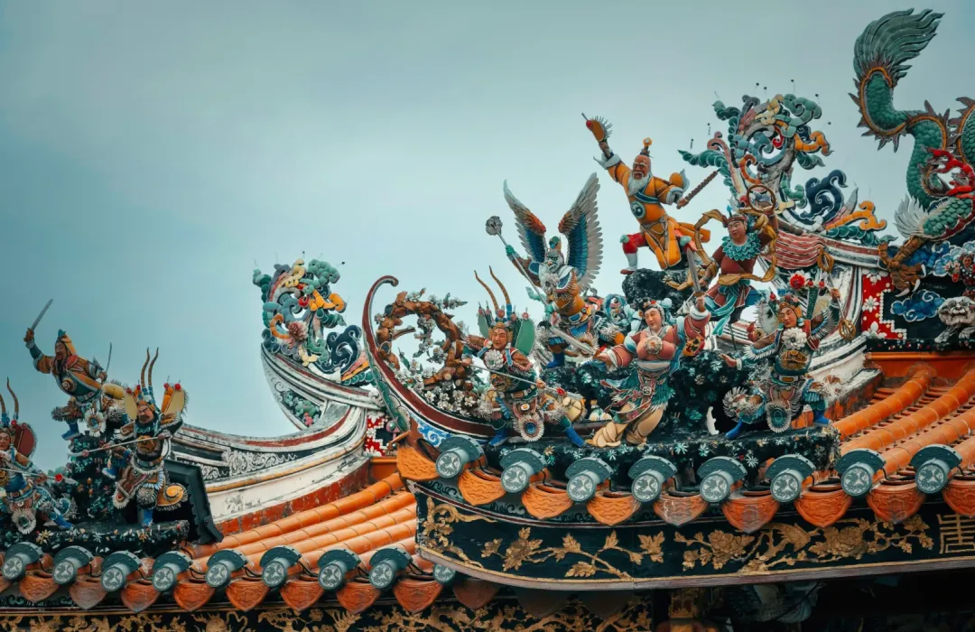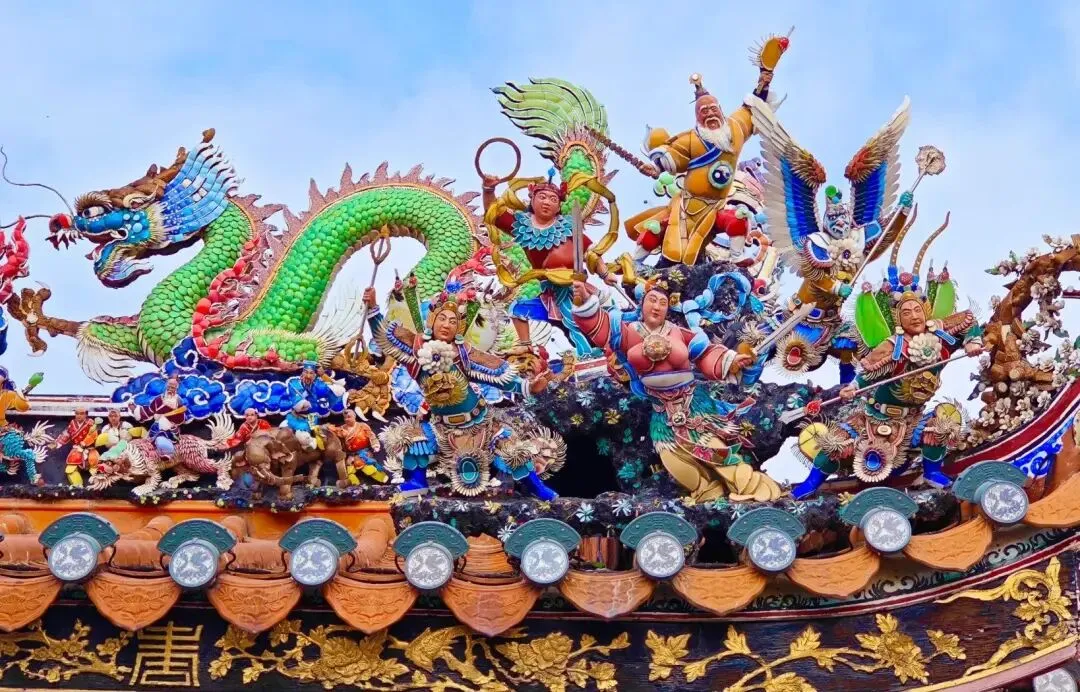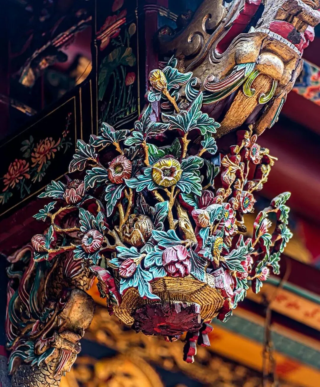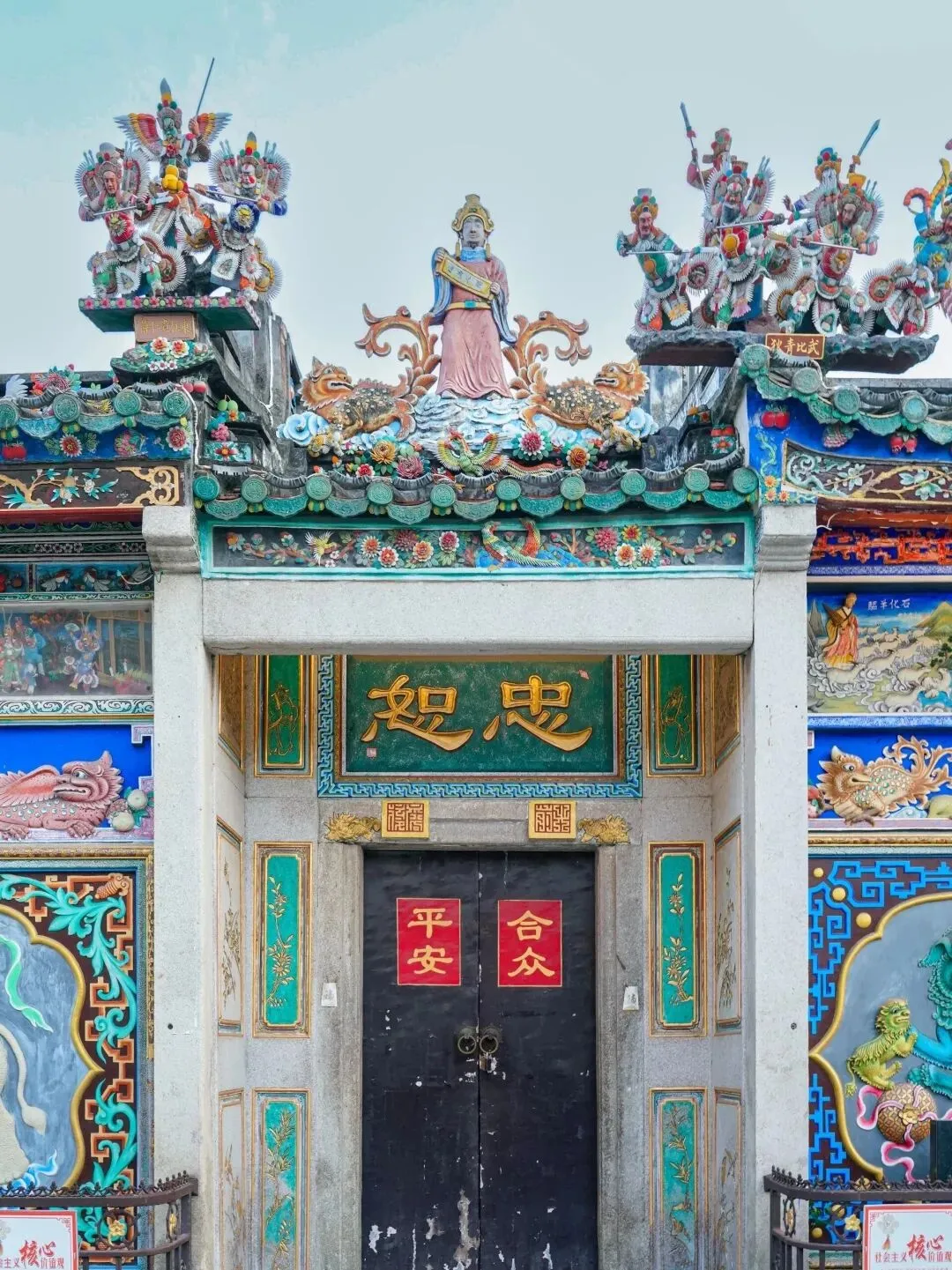 嵌瓷:屋顶脊饰采用潮汕独有工艺,将彩色瓷片切割打磨后镶嵌成人物、动物、花卉图案,色彩浓艳、构图精巧,被誉为“永远亮丽的造型艺术”。