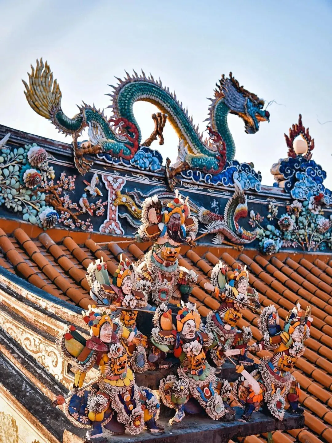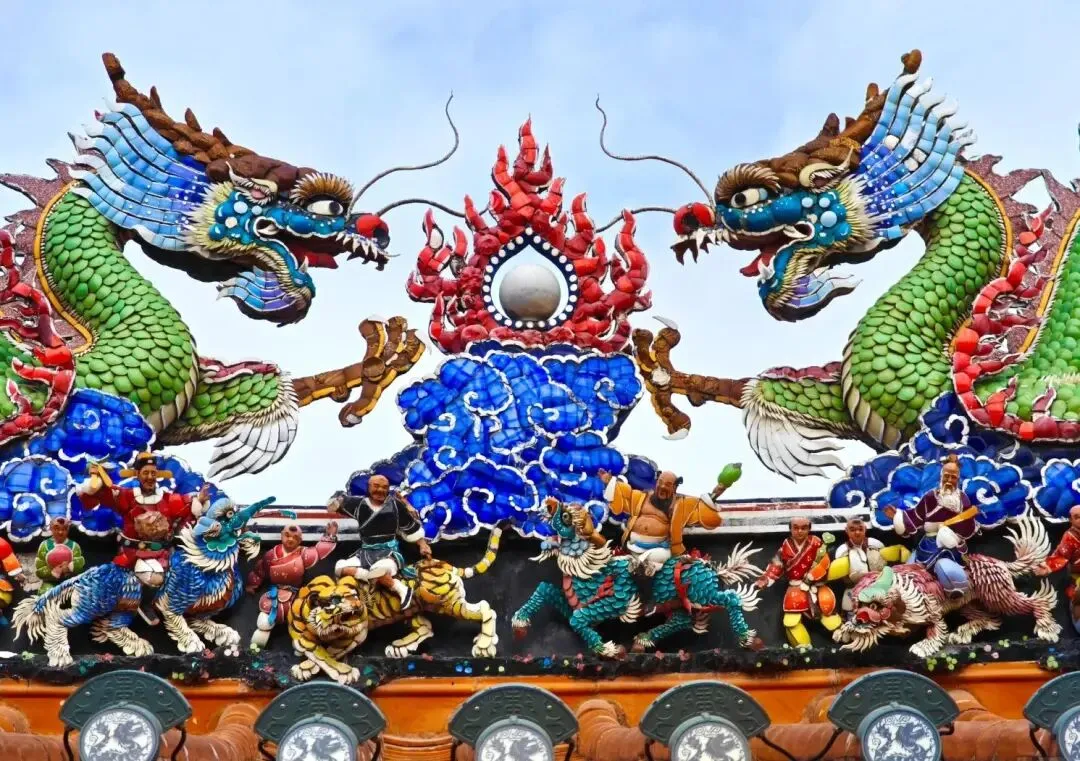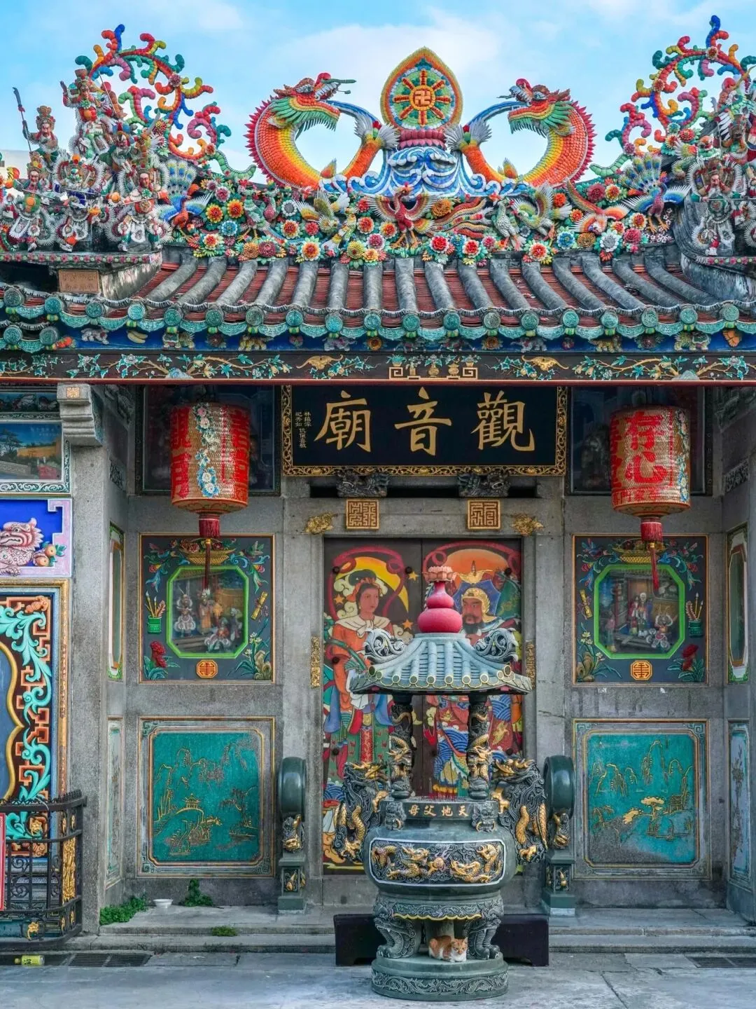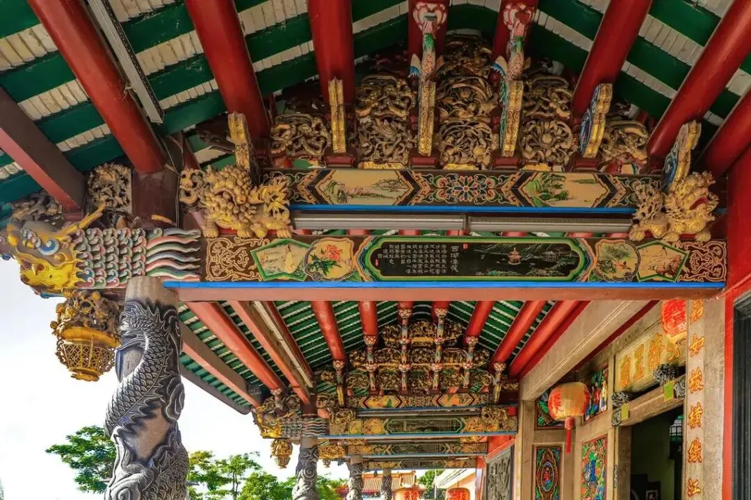 嵌瓷艺术:屋顶两条青龙及花鸟虫鱼嵌瓷栩栩如生,堪称潮州之最。