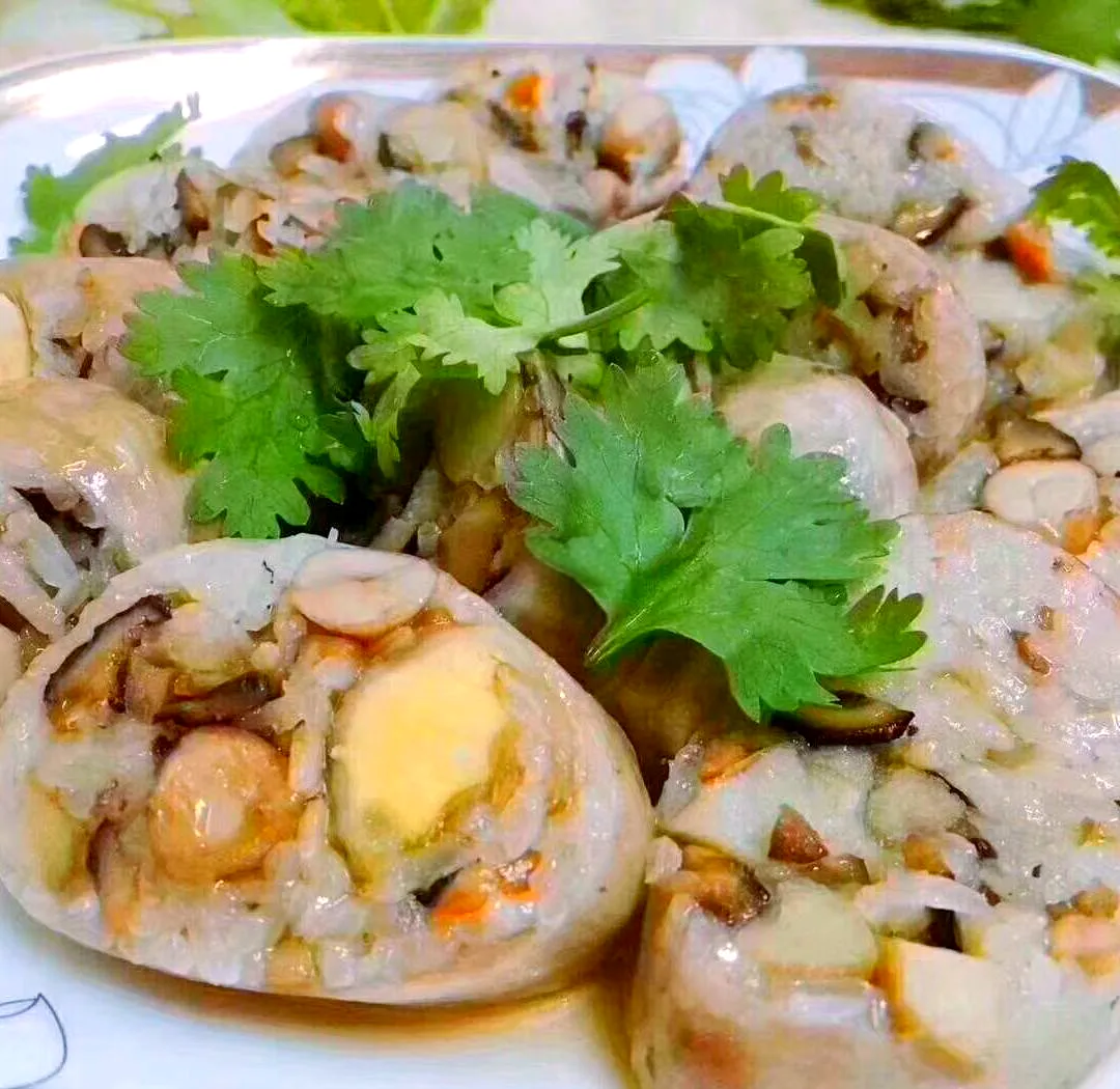 4、猪肠胀糯米:糯米、花生、香菇塞入猪肠,煮熟切片后淋甜酱油,软糯咸甜。