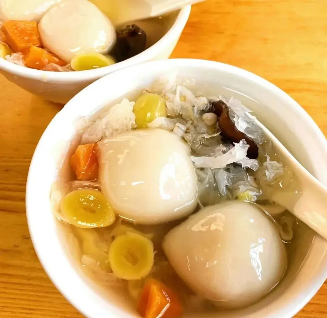 6、鸭母捻:手工搓制的糯米汤圆,形似鸭蛋,搭配姜糖水,甜润暖胃,常见于甜品店。