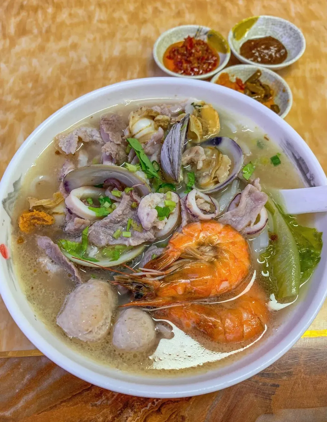 7、粿条汤/面汤:清甜骨汤底搭配新鲜猪肉、猪杂、海鲜(如鲜虾、蚝仔)或牛肉,撒上芹菜珠和蒜头朥,暖胃又满足。推荐店家:广场老牌豆花甜汤(薏米猪杂汤/海鲜汤)。