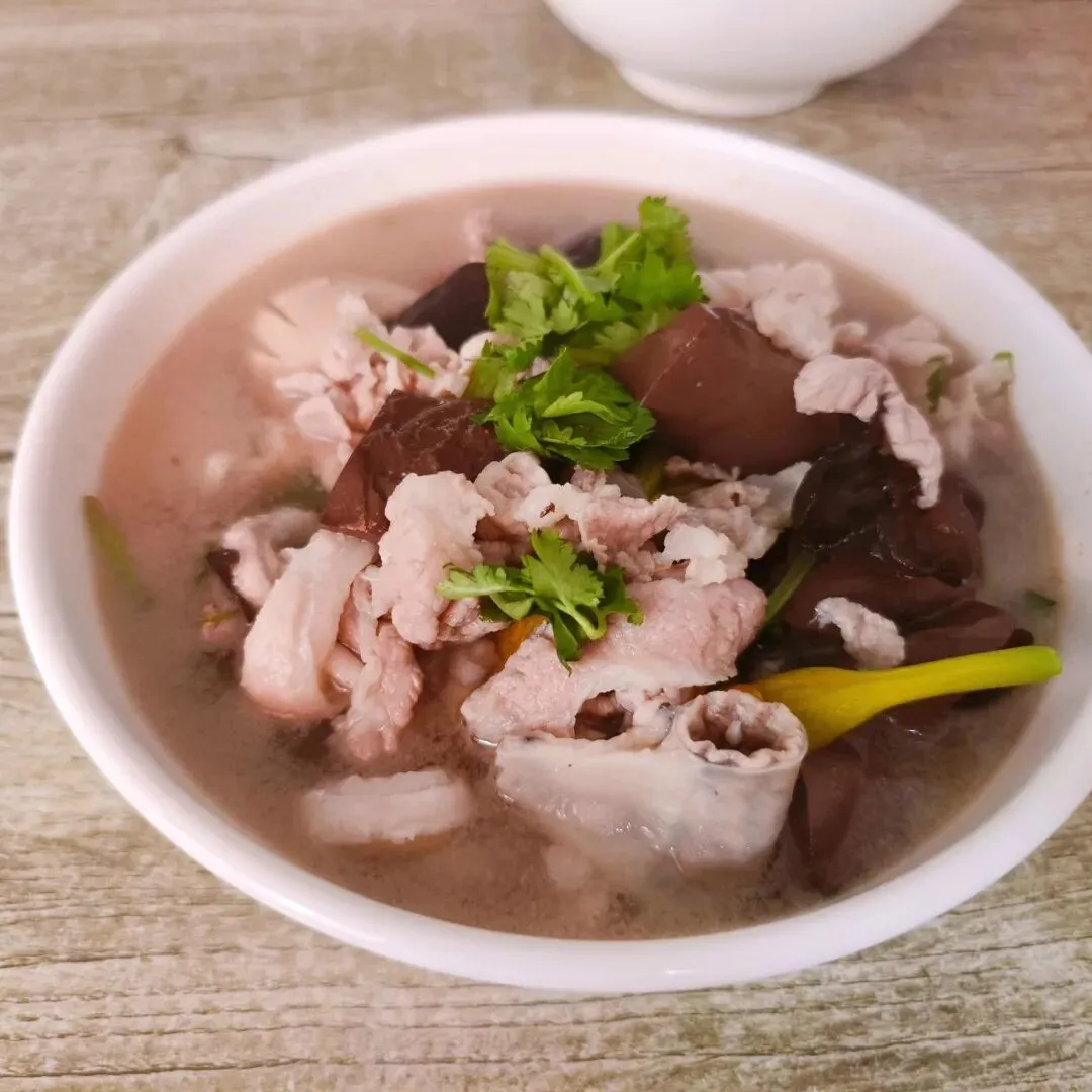 8、猪血汤:嫩滑猪血搭配益母草、西洋菜等时蔬,营养丰富,是潮汕早餐的经典选择。