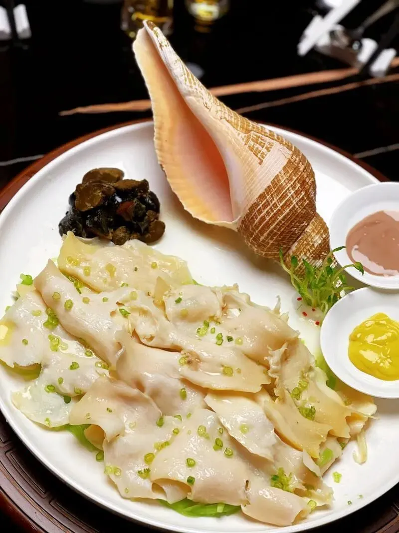 11、炭烧响螺:高端潮菜代表,一份售价高昂,螺肉鲜嫩,带有独特的炭火香气。