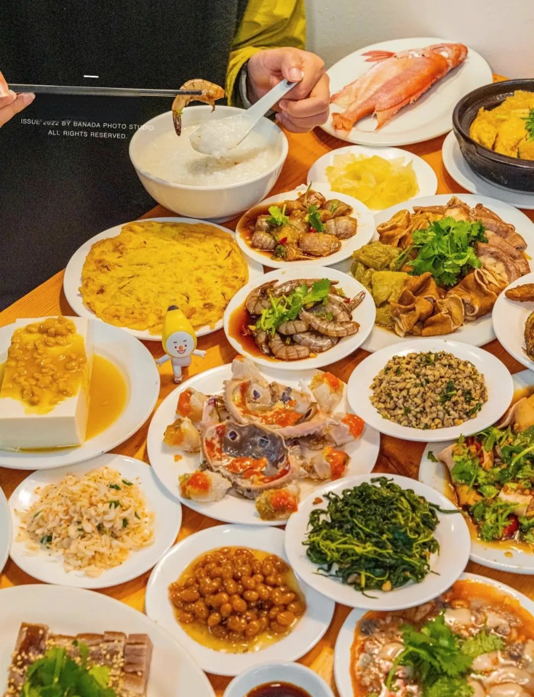 14、夜粥(白粥配杂咸):一碗温润白粥搭配琳琅满目的杂咸(如咸菜、菜脯、乌榄、贡菜、鱼饭、生腌蟹/虾蛄),是潮汕人“糜文化”的体现。推荐体验:长平老姿娘夜粥、富苑饮食。