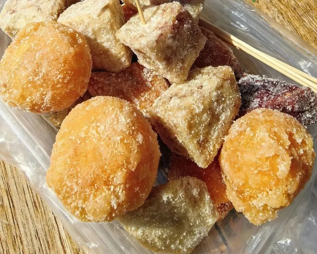 17、反沙甜品:香芋、紫薯、番薯裹糖霜,外甜内粉糯,趁热吃还会拉丝。