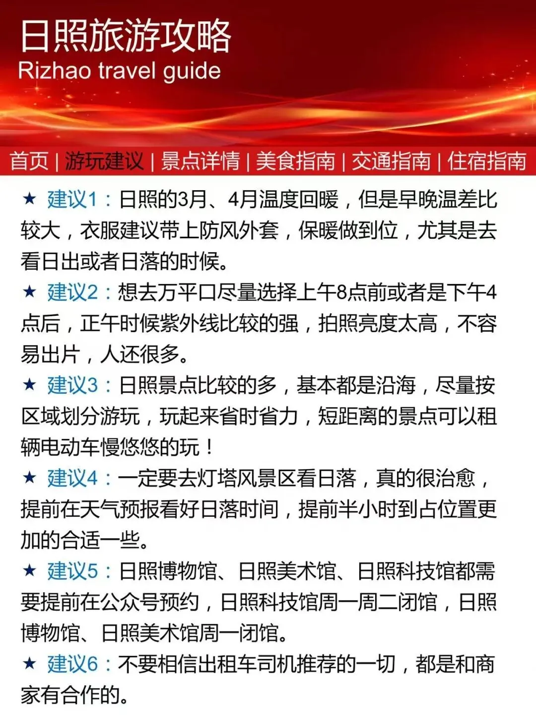 您现在的位置是:首页 > 国内旅游目的推荐 > 正文 国内旅游目的推荐 熬夜整理的日照游玩攻略! admin2026年04月09日 08:16:11国内旅游目的推荐1 熬夜整理的日照游玩攻略!熬夜整理的日照游玩攻略!#日照旅游攻略 #日照 #日照吃海鲜去哪 #日照美食 转载请说明来源于"旅荐网",部分内容转载自网络,如有侵权请联系qlwl@foxmail.com删除 本文地址:https://www.15386.cn/post/153451.html 上一篇 【新西兰第一大城奥克兰】怎么玩?超全景点攻略请收好~ 下一篇 4 月宠粉福利|免费送你去旅行!春日旅行攻略 + 宠粉大礼,一键抱走~ 相关文章 周四/旅行攻略、聚餐订座…我把生活琐事全丢给AI,每天多出2小时 4 月宠粉福利|免费送你去旅行!春日旅行攻略 + 宠粉大礼,一键抱走~ 【新西兰第一大城奥克兰】怎么玩?超全景点攻略请收好~ 苏州旅行指南:拙政园、平江路、山塘街全攻略 北京玉渡山旅游全攻略|保姆级避坑指南 2026年(第二十届)全国大学生文化旅游与会展竞赛的通知! 专业介绍旅游地学与规划工程 三亚旅游/4天详细攻略 【清明假期免费出游运城30家景区攻略】运城旅游年票一票在手,全年不限次游玩,你还没有吗? 广东潮汕旅游攻略:北上广深是生存,潮汕才是生活.千年潮韵,一城烟火,这个秋天,去潮汕吃垮一条街! 发表评论 取消回复 评论列表 这篇文章还没有收到评论,赶紧来抢沙发吧~