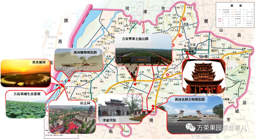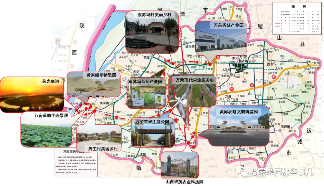万荣香菇产业园—苹果主题公园—周王村美丽乡村—万亩黄汾湿地产业带(观荣光幂河—黄河文化雕塑博览园—万亩荷塘)