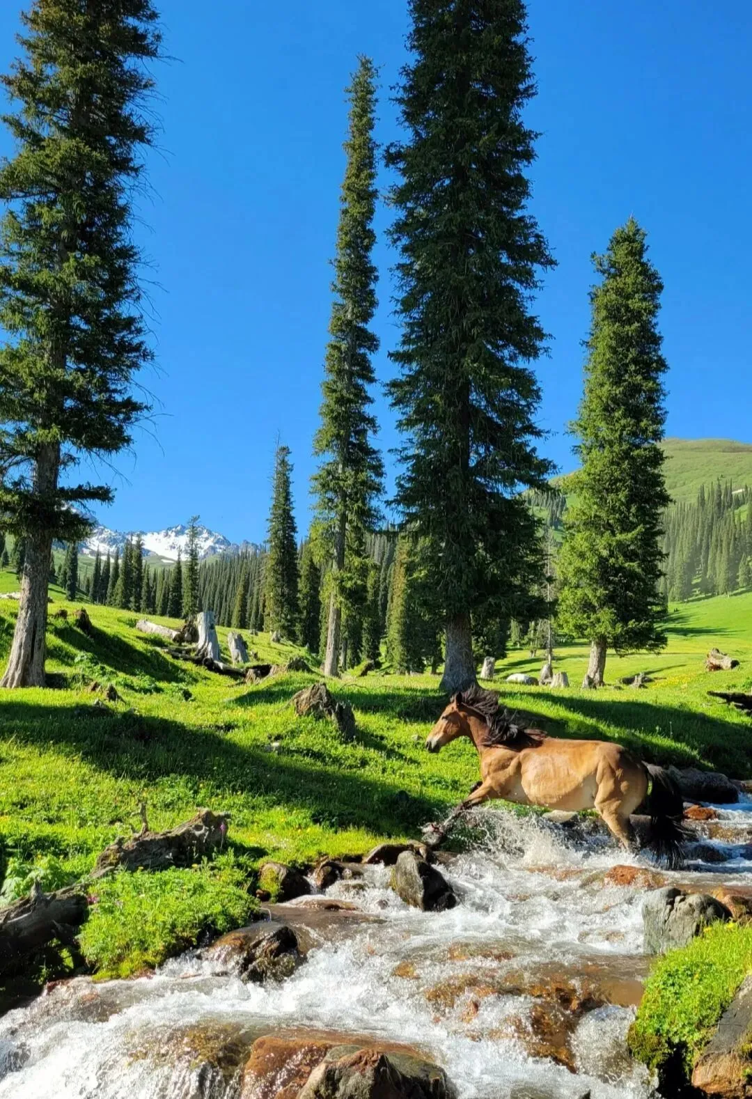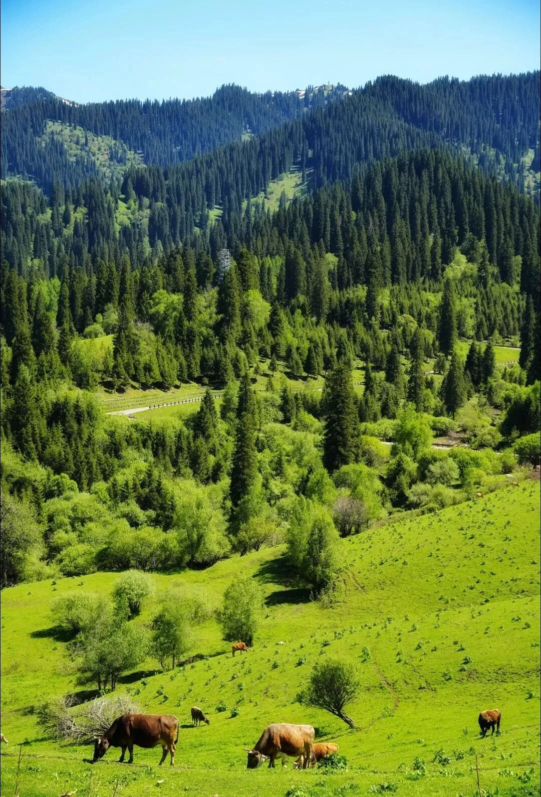 5 月开始,那拉提、喀拉峻、恰西草原全面变绿,野花遍地,牛羊成群,像走进宫崎骏的动画世界。草原徒步、骑马、露营都非常合适,人少景静,体验感拉满。